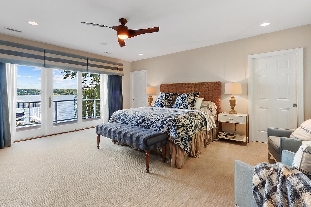 A spacious master bedroom with floor-to-ceiling windows and patio doors presents breathtaking lake views, perfect for both relaxation and family enjoyment. The room features a soft beige carpet and walls, balancing warmth with open space, while natural light pours in, making it bright and inviting. The king bed, dressed in botanical-print linens and topped with plush pillows, is flanked by matching nightstands and lamps for symmetry. A blue cushioned bench sits at the foot of the bed for convenience and added seating. Cozy armchairs and a contemporary ceiling fan complete the serene, family-friendly retreat.