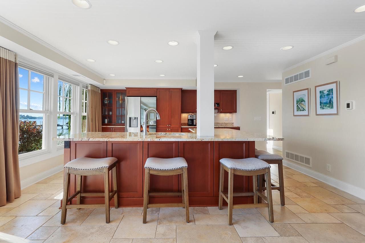 A spacious kitchen is flooded with natural light from large windows, offering a picturesque view of the outdoors. The centerpiece is a substantial kitchen island, finished with warm cherrywood cabinetry and a polished marble countertop, providing ample workspace for cooking and gathering. Three comfortable upholstered barstools make it an inviting spot for casual family meals, snacks, or homework sessions. The open layout connects the kitchen seamlessly to adjacent living spaces, enhancing family togetherness. Neutral tile flooring, soft beige walls, and subtle recessed lighting add an airy and welcoming feel, while accent art and organized cabinetry lend a touch of sophistication and practicality.