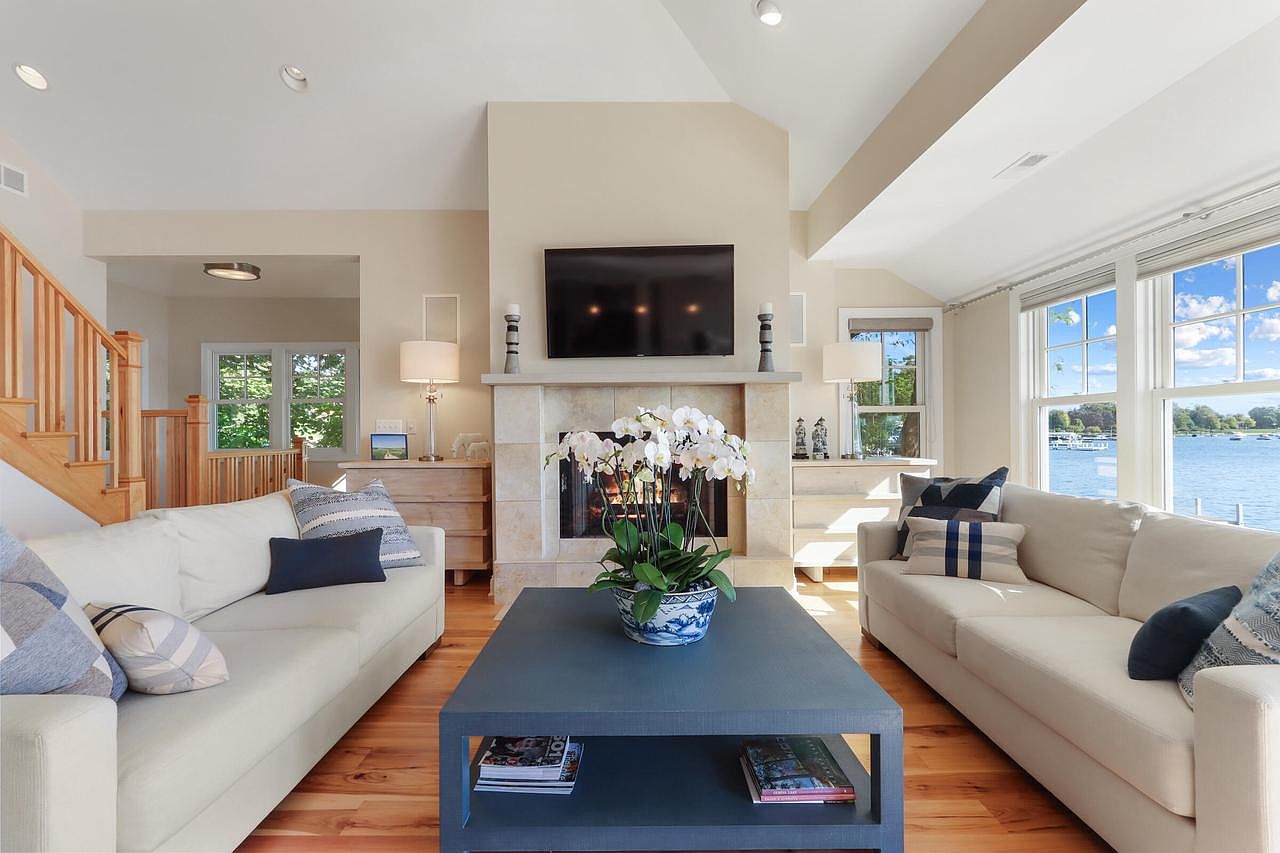 A bright, spacious living room designed for comfort and connection, this area features two plush cream sofas arranged around a chic navy coffee table, perfect for family games or relaxed conversations. Large windows flood the room with natural light and frame stunning water views, enhancing the serene ambiance. Architectural details include a striking fireplace with a mounted TV above, warm wood flooring, and soft neutral wall tones. Pops of blue through cushions and décor tie the interior to the lake view outside, while a staircase leads to more private family spaces. Thoughtful touches like reading material and elegant lighting make it inviting for all ages.