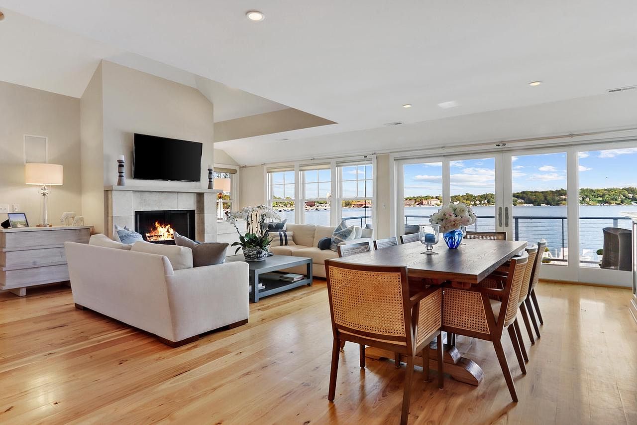 This spacious open-concept living and dining area is bathed in natural light thanks to expansive waterfront windows offering panoramic lake views. The cozy fireplace and neutral color palette create a relaxing ambiance, complemented by light wood floors and soft cream sofas with accent pillows. The sturdy wooden dining table, surrounded by woven-back chairs, provides ample space for family gatherings and meals. The room’s thoughtful layout encourages seamless flow between lounging and dining, making it both welcoming and functional for families. Decorative elements like fresh floral arrangements and minimalist art add sophistication without sacrificing comfort or practicality.