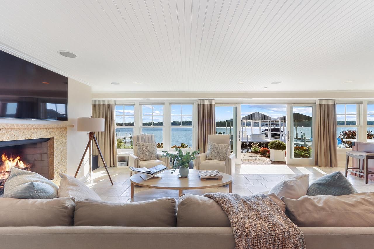This inviting open-plan space features a stunning blend of kitchen and living room, highlighted by expansive windows offering sweeping waterfront views. The kitchen boasts a large granite island with plush upholstered bar stools, perfect for casual family gatherings. Soft neutral tones of beige, cream, and warm wood create a calming, fresh atmosphere. The living area centers around a cozy fireplace with comfortable seating, ideal for relaxing evenings. Recessed lighting and a coffered ceiling enhance the bright, airy ambiance, while the family-friendly layout seamlessly connects indoor living with the serene outdoor landscape.