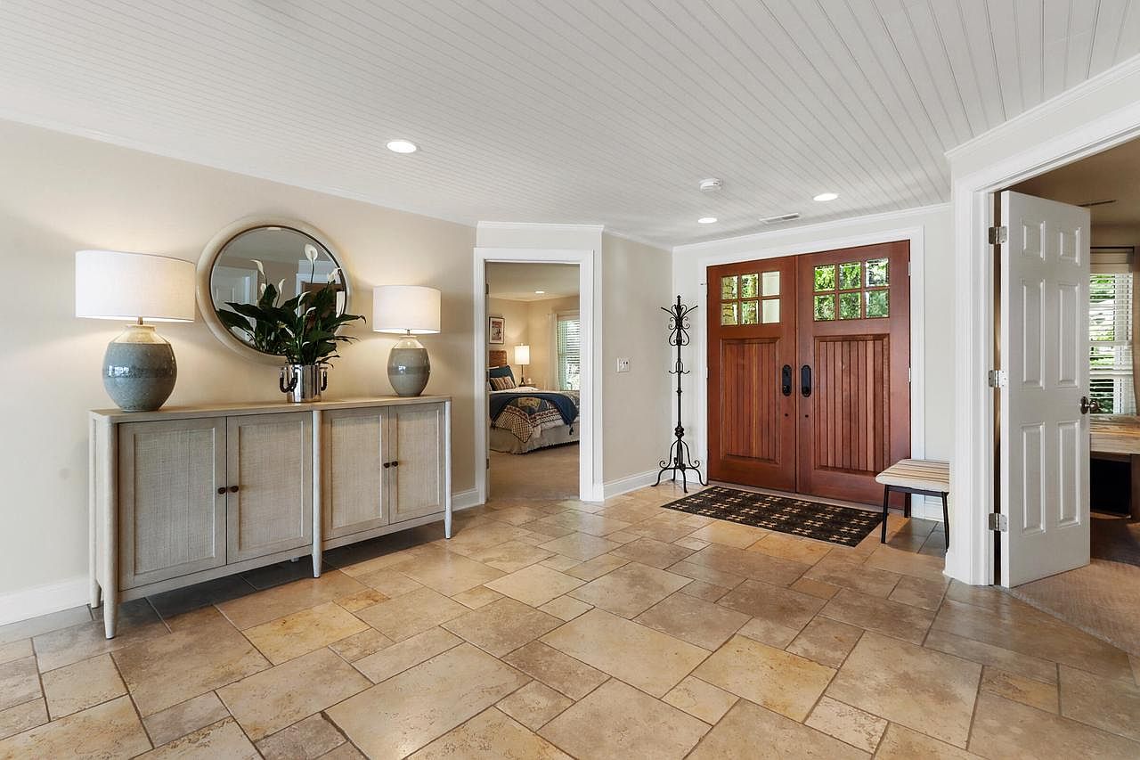 A spacious and welcoming entryway features warm wooden double doors with glass panes, creating an inviting first impression. The neutral tiled flooring is both elegant and durable, making it practical for families. A light wood console table offers ample storage for shoes, bags, or seasonal accessories, topped with two large ceramic lamps and a lush green plant for natural flair. A round mirror above the console adds depth, reflecting natural light throughout the space. Soft beige walls, white trim, and a beadboard ceiling create a fresh, airy vibe, while a coat rack and bench enhance functionality for busy households.