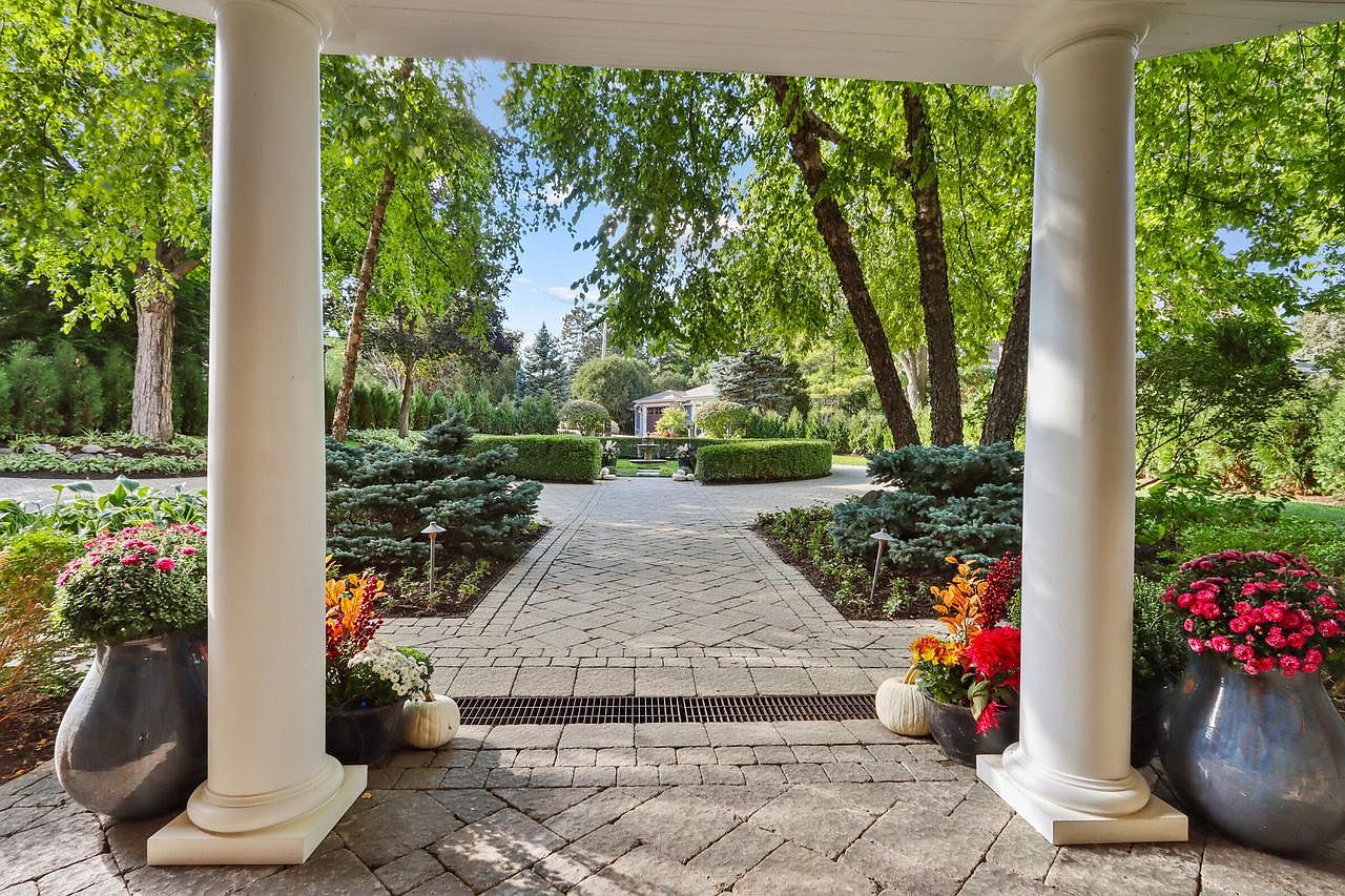 The entryway showcases classic white columns framing a welcoming front porch, adorned with large ceramic planters overflowing with vibrant seasonal flowers and lush greenery. The stone-paved pathway leads straight ahead through formal landscaping, including manicured hedges and sculpted evergreens, guiding visitors to a peaceful garden pavilion at the center. Mature trees provide dappled shade, creating a serene and safe atmosphere ideal for families with children. Soft lighting fixtures flanking the walkway enhance both safety and nighttime ambiance. The overall design exudes timeless elegance, blending traditional architectural details with a family-friendly, approachable exterior space.