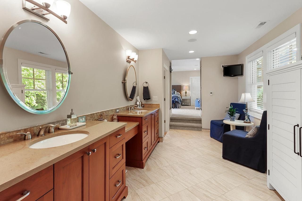A serene bathroom suite blends comfort and style, offering dual vanities with elegant tan countertops and ample wooden cabinetry for easy organization, ideal for busy family mornings. Warm neutral tiles on the floor complement soft beige walls and natural light streaming through wide windows. The space features round mirrors, under-sink storage, and modern lighting fixtures for both functionality and aesthetic appeal. Across from the vanities, cozy navy blue lounge chairs with striped pillows create a perfect sitting nook. With direct access to a plush carpeted bedroom, this bathroom offers accessibility and family-friendly design for a busy household.