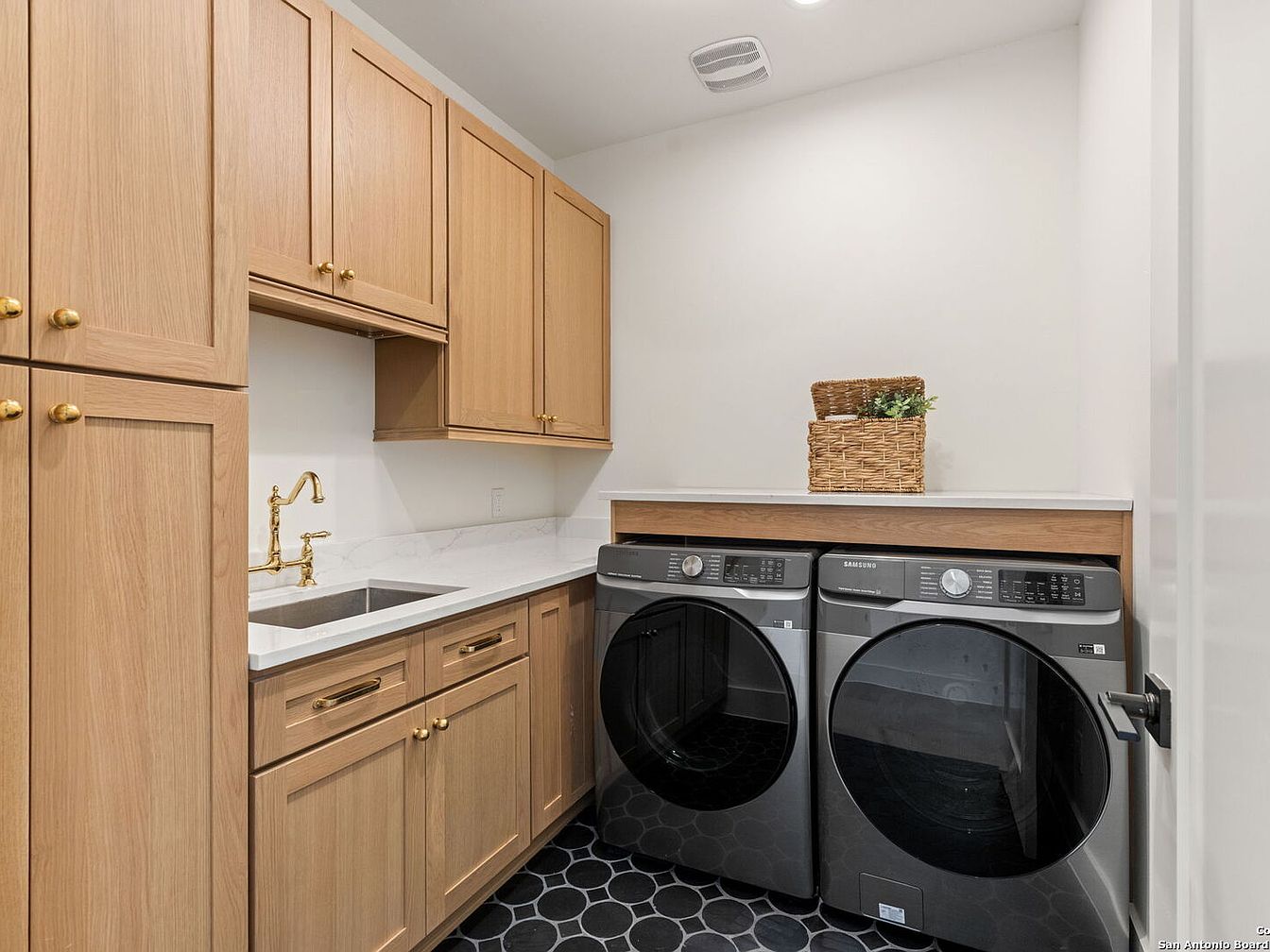This laundry room blends functionality with modern aesthetics. Featuring sleek dark appliances, it is complemented by warm wood cabinetry that provides ample storage space. The elegant gold hardware adds a touch of luxury, while the white quartz countertop offers a spacious area for sorting and folding laundry. The unique hexagonal tile flooring brings a stylish contrast against the light-colored walls, enhancing the room’s contemporary feel. The thoughtful layout ensures ease of movement, making it family-friendly. Additionally, an integrated sink adds practicality, making this laundry space not only efficient but also visually pleasing, perfect for everyday tasks.