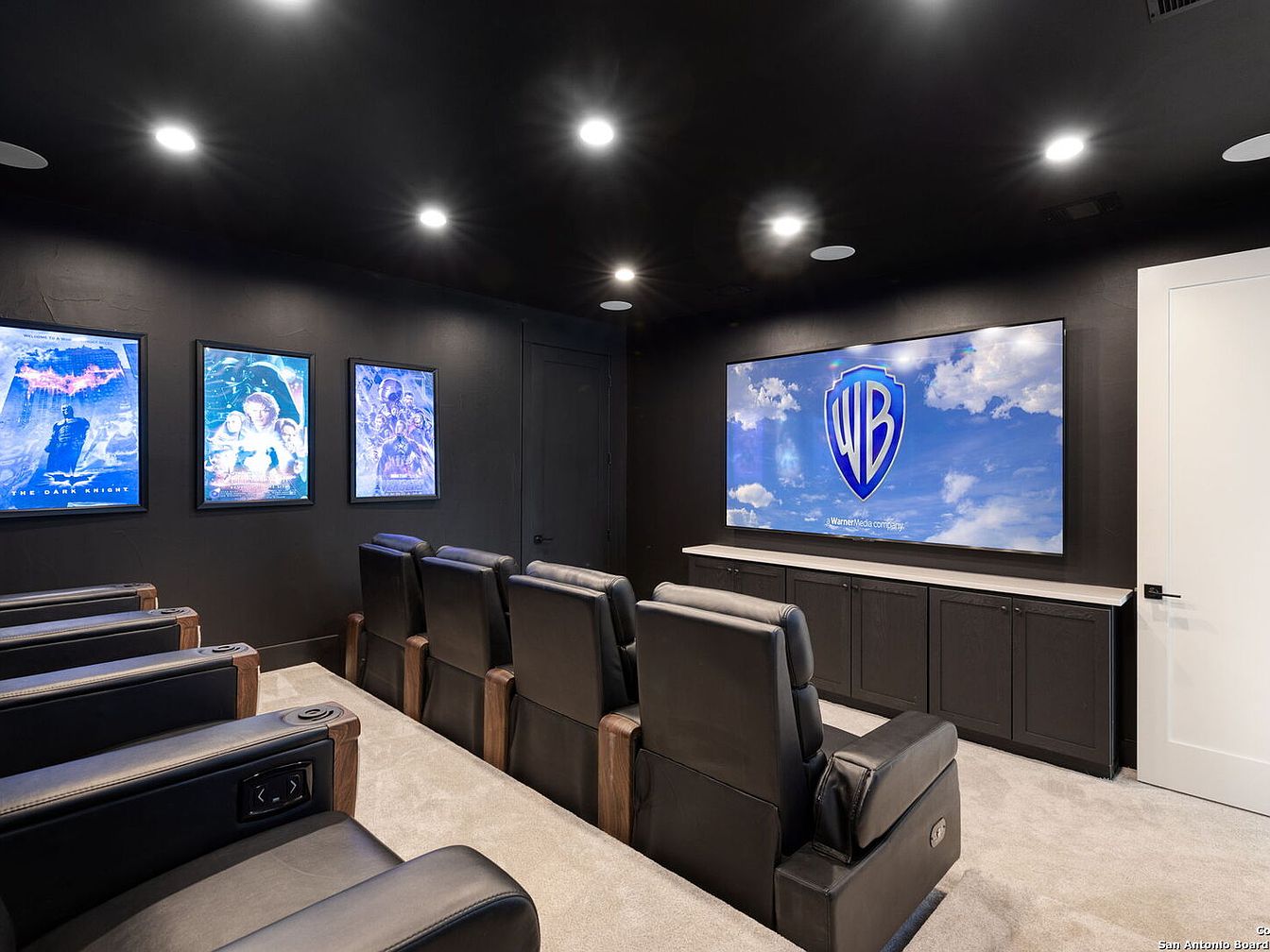 This inviting home theater boasts a sleek, modern aesthetic enhanced by a rich black color scheme. Plush, reclining leather seating offers comfort, while high ceilings adorned with recessed lighting create an immersive atmosphere. The room features framed movie posters that add a personal touch, showcasing a love for cinema. A large wall-mounted screen, positioned centrally, promises a captivating viewing experience. Built-in cabinetry underneath the screen provides practical storage for electronics and movies, maintaining the clean lines of the room. The soft carpet underfoot enhances acoustics and invites relaxation, making this space perfect for family movie nights.