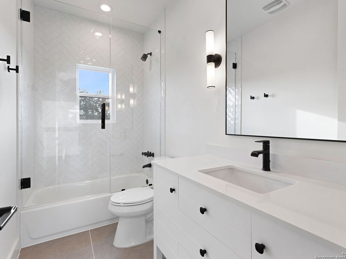This contemporary bathroom features a sleek, minimalist layout emphasizing clean lines and a bright, airy ambiance. The striking herringbone-patterned backsplash in soft white contrasts beautifully with matte black fixtures, creating a sophisticated look. A glass shower enclosure enhances the sense of space, allowing natural light to flood in, while the spacious bathtub invites relaxation. The double vanity boasts ample storage with modern drawer handles, and the chic sconces provide warm illumination. The neutral color scheme combined with natural light creates a family-friendly environment, perfect for both daily routines and serene moments of self-care.