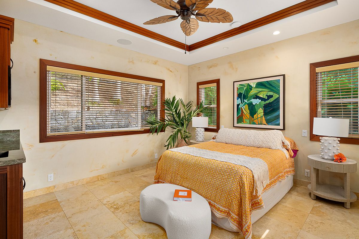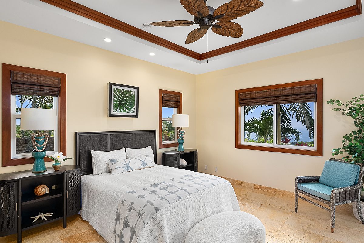 This serene master bedroom features a spacious layout enhanced by a tranquil color palette of neutrals and coastal blues. A plush king-sized bed, adorned with vibrant blue and aqua accent pillows, invites relaxation. The elegant ceiling fan with leaf-shaped blades adds a tropical touch, complemented by recessed lighting that softly illuminates the room. Natural light pours in through the large windows, framed by rich wood, providing a connection to the outdoors. The tasteful furniture, including a modern nightstand and a cozy accent chair, blends functionality with style. The polished stone flooring adds a luxurious feel, making it a perfect retreat for restful nights.