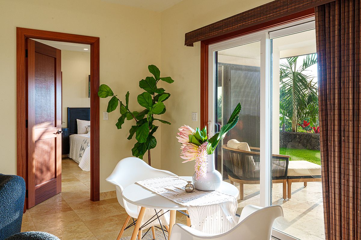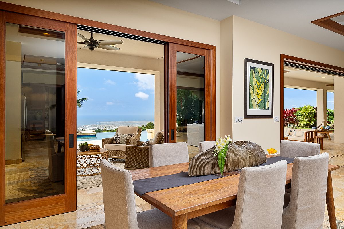 This inviting dining area seamlessly blends indoor and outdoor living, highlighted by large glass pocket doors that open to breathtaking views of the ocean. The wooden dining table, paired with plush beige chairs, offers a perfect setting for family meals. A stylish centerpiece showcases natural elements, enhancing the warm, earthy color palette. Light beige walls complement the rich wood detailing, while a textured ceiling fan adds a touch of elegance. Natural light floods the space, creating a welcoming atmosphere for gatherings. Outside, comfortable seating overlooks the pool, providing a perfect spot for relaxation and enjoyment.