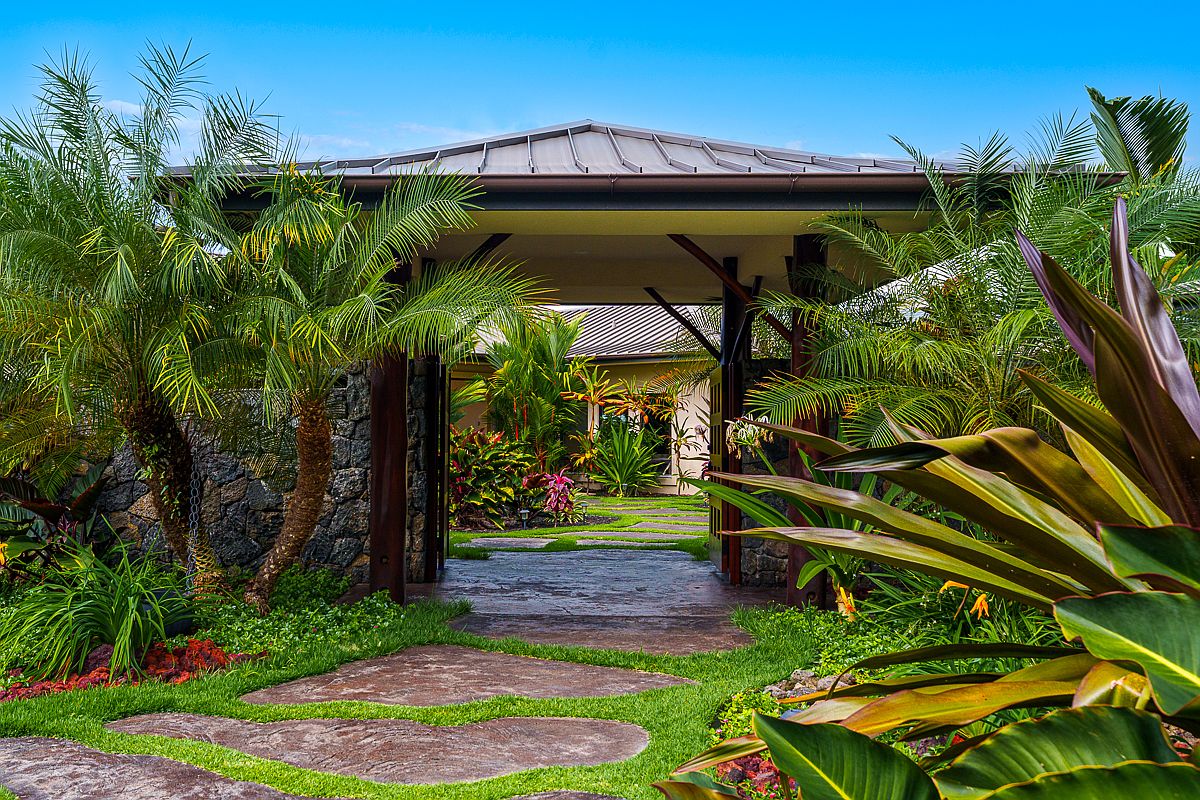 This stunning entryway showcases a harmonious blend of natural elements and architectural elegance. The path, lined with smooth stone slabs, gracefully winds through lush greenery, including vibrant tropical plants and palm trees, creating a serene atmosphere. The earthy tones of the stone walls complement the rich hues of the foliage, while the wooden structural beams add warmth and character. Tall, welcoming doors invite guests into the space, hinting at the comfortable, family-friendly nature of the home. The thoughtfully designed landscaping enhances the inviting feel, making it a perfect transition from the outdoors to the comfort of home.