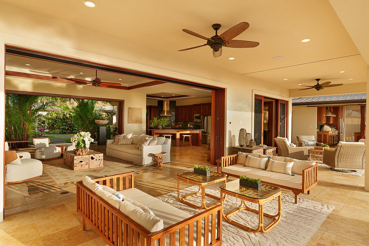 This inviting outdoor living area blends seamlessly with the surrounding landscape, featuring rich wooden accents and neutral tones. Spacious seating, including a cozy sectional and lounge chairs, encourages relaxation and conversation. A rustic coffee table made from reclaimed wood centers the space, adorned with green plants for a refreshing touch. Natural light floods the area through expansive sliding glass doors, further connecting the indoors with the outdoor beauty. Ceiling fans enhance comfort, while the tile flooring complements the airy aesthetic. Ideal for family gatherings or quiet evenings, this space prioritizes comfort and an enjoyable outdoor lifestyle.
