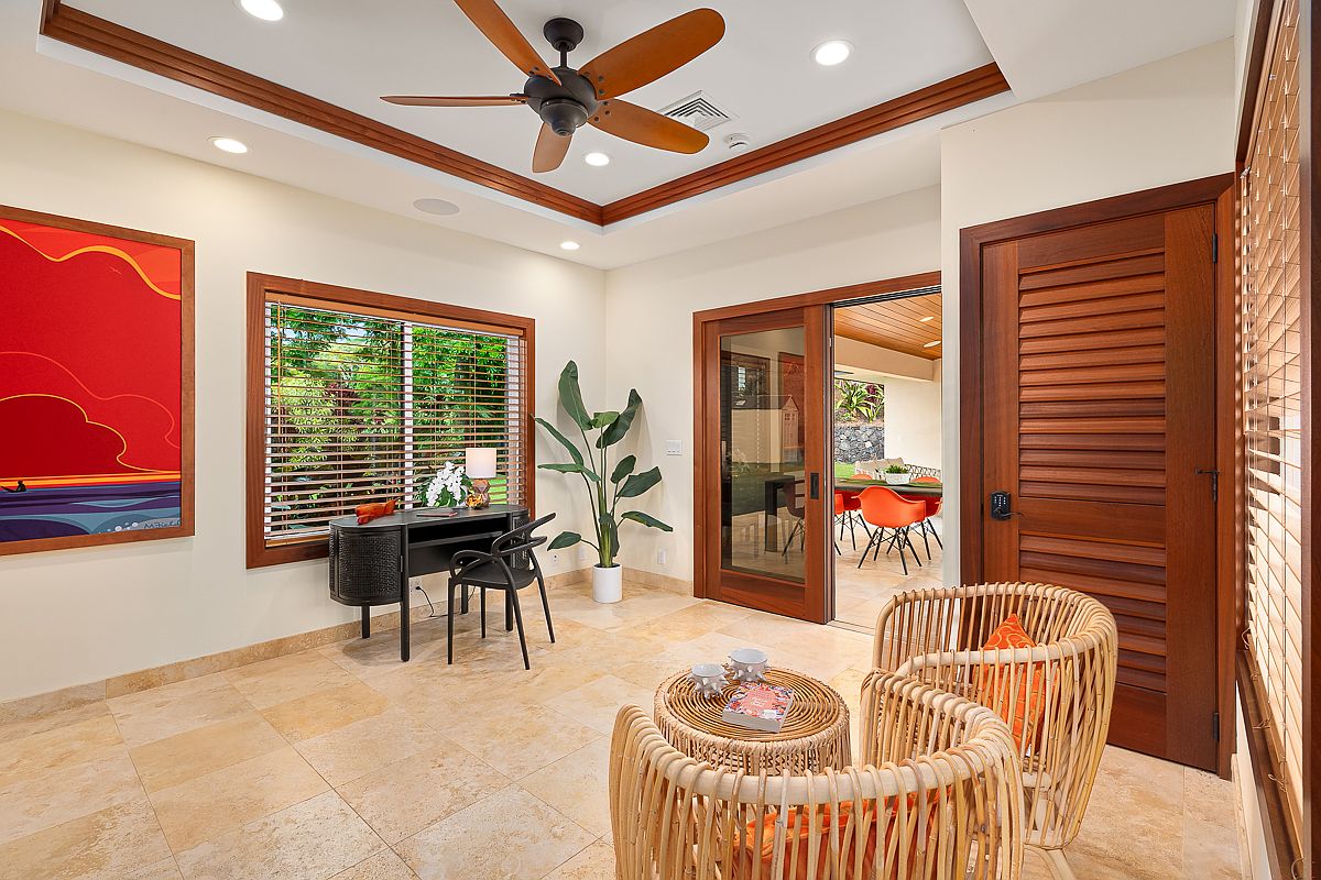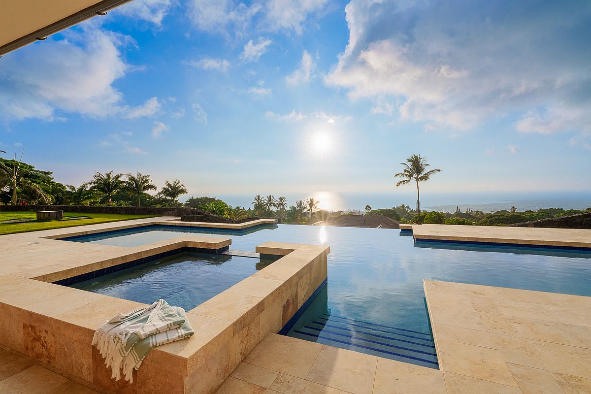 Perched above Kona Town, Hoku‘aka epitomizes both luxury and modern living, nestled in a serene gated community with breathtaking ocean vistas. This contemporary pod-style estate, blending island craftsmanship with elegance, features over 5,000 square feet of indoor-outdoor living, nine-foot sapele mahogany doors, and a stunning 50-foot infinity pool. Built in the early 2000s, it boasts recent renovations, including a fully equipped outdoor kitchen and landscaped gardens. With its transferable Bed-and-Breakfast permit and ideal elevation of 840 ft., this one-acre property is designed for success-oriented individuals seeking tranquility. Priced at $4.7 million, it stands out as a prime investment in Kailua-Kona’s thriving real estate market.