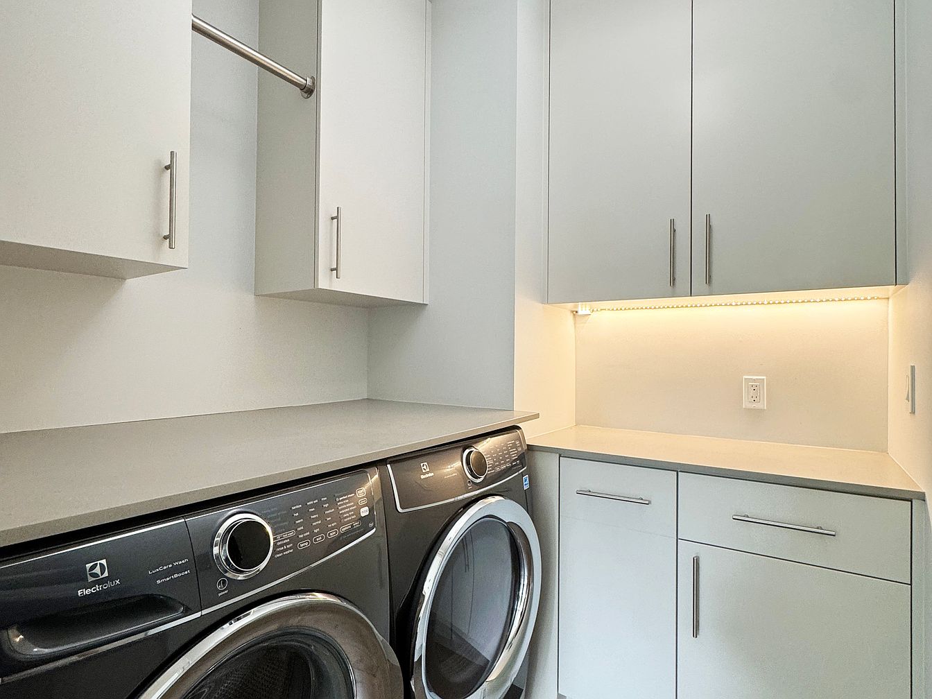 A sleek and modern laundry room designed for both efficiency and style, featuring a streamlined countertop over front-loading washer and dryer units. Cabinets above and below offer generous storage, keeping household essentials organized and out of sight. A dedicated hanging rod provides a convenient space for air-drying delicate clothing. The neutral color palette in shades of soft gray and white lends a bright, airy feel, while under-cabinet lighting creates a welcoming workspace. Clean lines, modern hardware, and thoughtfully designed cabinetry ensure this functional space is both family-friendly and visually appealing for everyday home living.