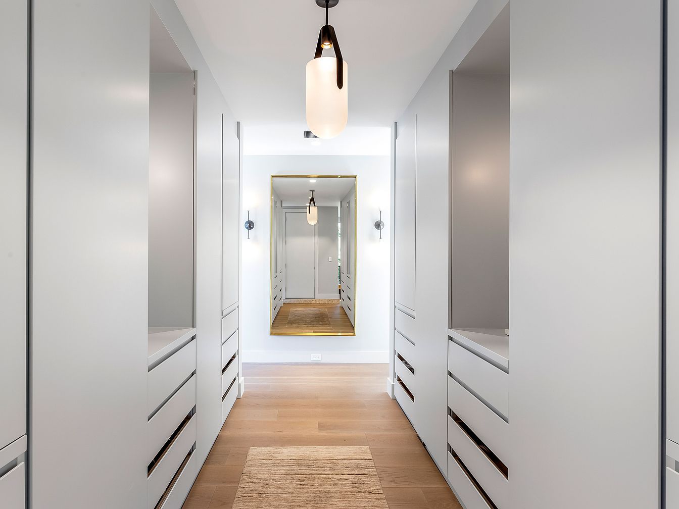 This spacious walk-in closet offers a luxurious and organized retreat with sleek built-in cabinetry lining both sides, providing ample storage for clothing and accessories. The subtle, powder-gray cabinets and drawers exemplify modern minimalism, complemented by a light natural wood floor that brings warmth and comfort. Soft white walls and contemporary light fixtures create a bright, inviting atmosphere. A large mirror at the end visually expands the space and adds utility for getting ready. The design promotes practicality for busy families while maintaining elegance, ensuring everyone has a dedicated place for their belongings and fostering a clutter-free environment.