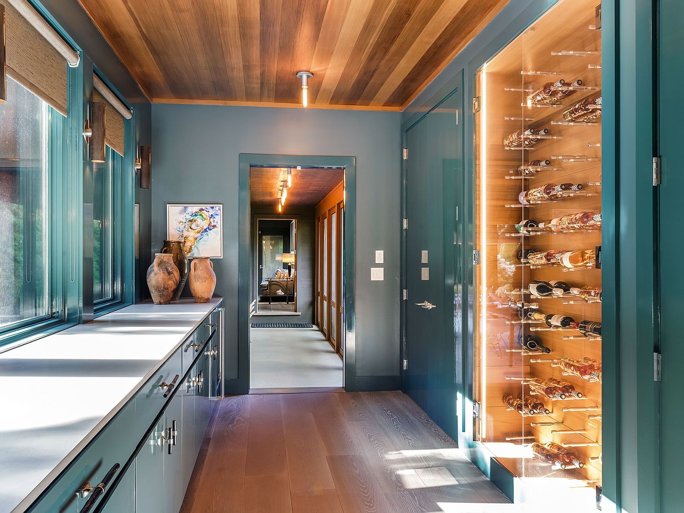 A bright hallway featuring floor-to-ceiling windows on one side creates an inviting and functional transition space in the home. The custom-built cabinetry with sleek, contemporary handles provides ample storage, while the built-in, glass-enclosed wine display adds a luxurious touch and serves as a visual focal point. Earthy vases and modern art contribute artistic flair and warmth, balanced by the cool teal wall color. The wooden plank ceiling introduces a natural element that enhances the coziness. Bathed in natural light, this hallway is practical yet stylish, ideal for family gatherings and easy entertaining with clear access between living areas.