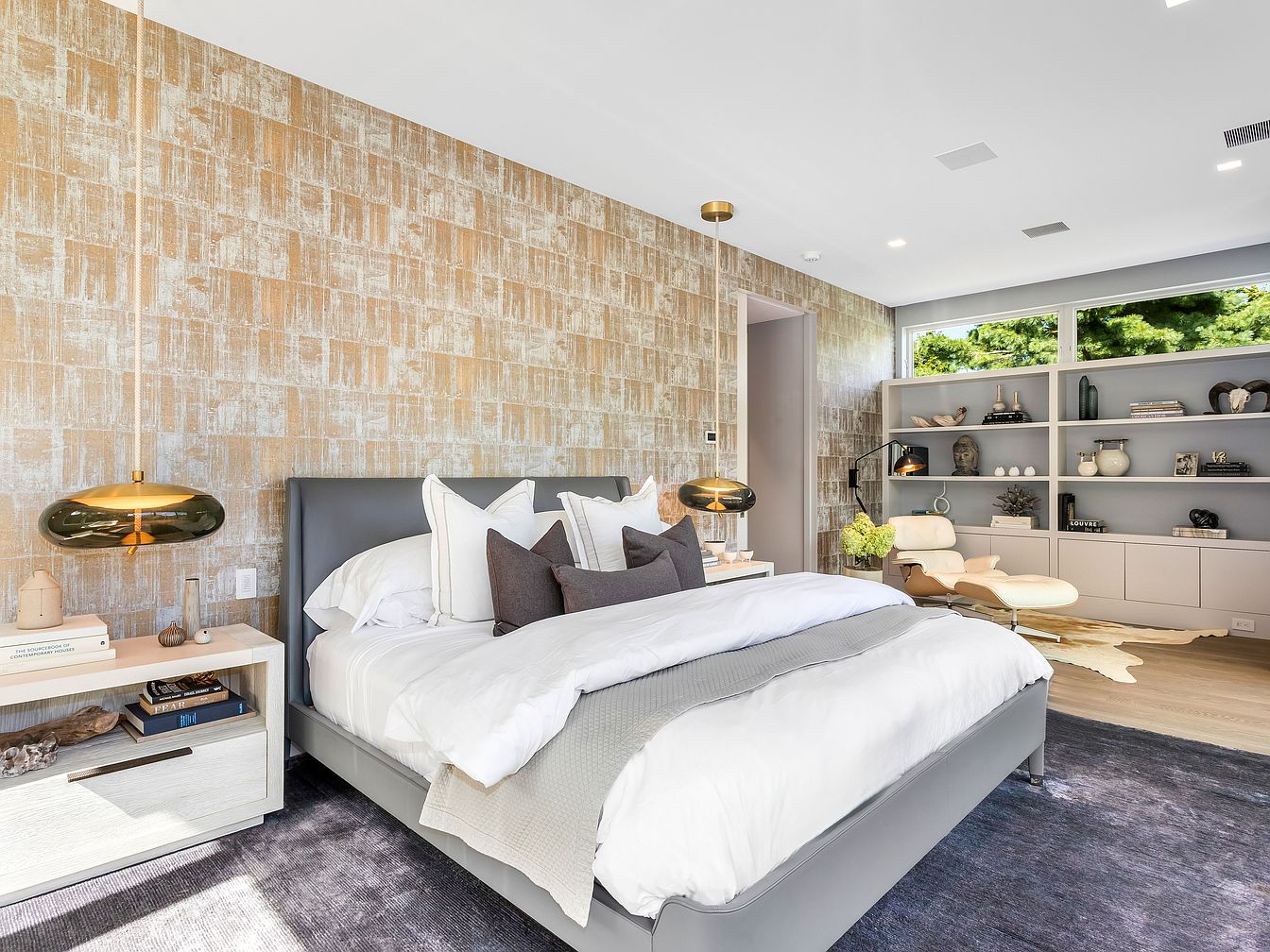 This master bedroom exudes modern comfort with its soft neutral palette accented by warm golden tones on the textured feature wall. The generous bed, outfitted with plush white linens and layered throw pillows, promises a restful escape. Floating nightstands with unique pendant lighting add style and functionality, perfect for bedtime reading. The room features an open layout with a cozy seating area, including an Eames-style lounge chair set beside minimalist built-in shelving filled with thoughtful decor and books, making this space ideal for relaxation or quiet family moments. Large windows invite natural light and garden views, creating an inviting, airy ambiance.