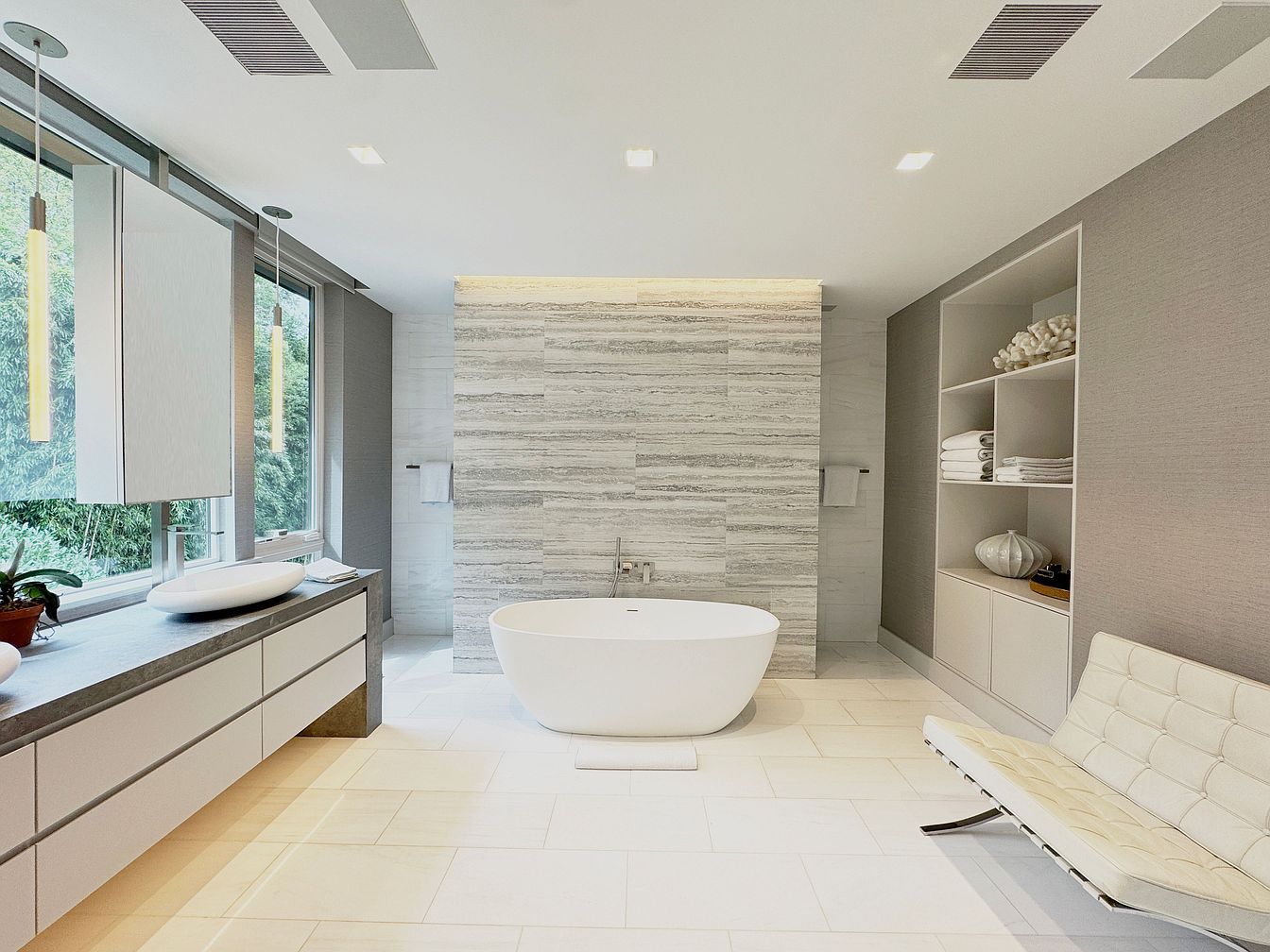 A spacious bathroom adorned in calming neutral tones features a striking freestanding bathtub centered against a textured stone accent wall. Expansive floor-to-ceiling windows invite natural light and offer serene garden views, enhancing the tranquil atmosphere. Sleek cabinetry and open shelving hold neatly folded towels and decorative accents, blending practicality with style. Modern pendant lighting and vessel sinks exude contemporary elegance, while the generous layout provides ample space for movement, making bath time enjoyable for families or quiet moments of relaxation. An inviting white lounge chair completes this luxurious, welcoming retreat that balances comfort and sophistication.