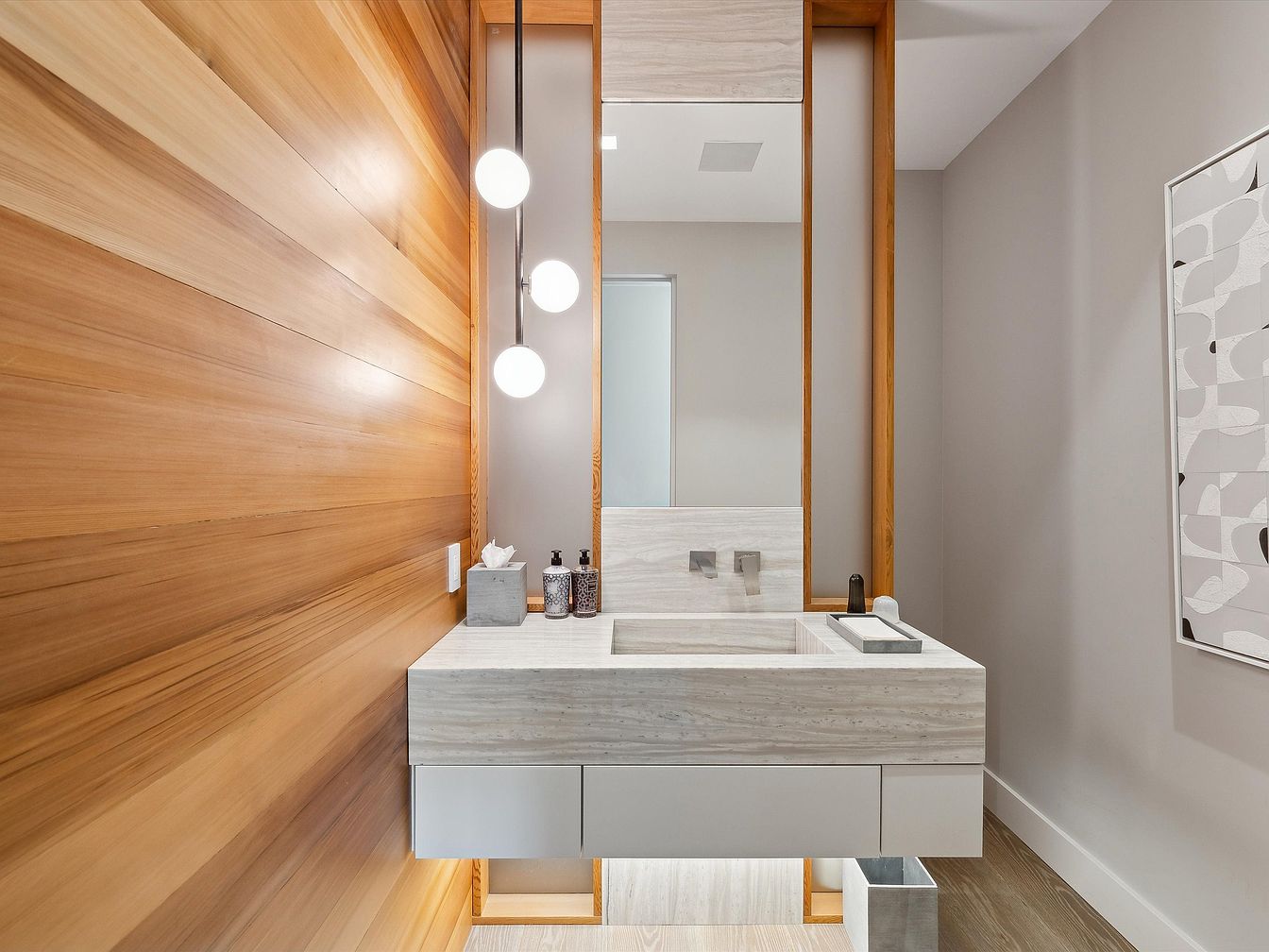 Sleek and inviting, this powder room features a floating vanity constructed from light stone, paired with integrated dual-toned faucets for a clean, minimalist look. Warm horizontal wood paneling along one wall softens the modern lines and complements the light gray walls, creating a cozy feel perfect for family use. Bright globe pendant lights and a large vertical mirror open up the space and enhance natural light. Elegant yet practical, the room includes ample counter space for essentials and a contemporary art piece for added visual interest. The design balances aesthetics with easy maintenance and safety, making it family friendly.