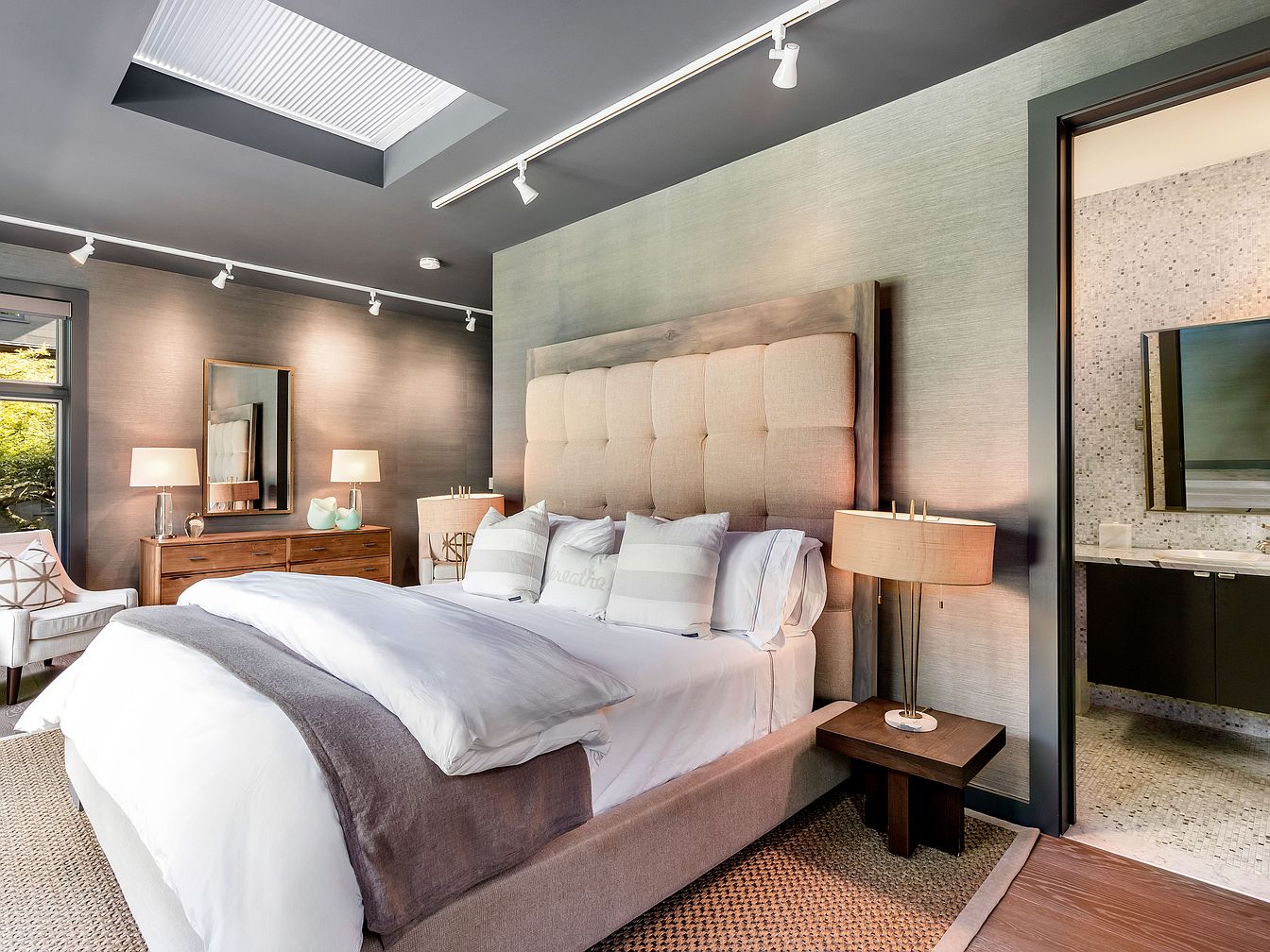 A serene master bedroom features a plush, upholstered headboard and layered bedding in crisp white and muted gray tones, creating a calming atmosphere. Natural light pours in from a skylight and large windows, enhancing the soft, neutral color palette. The room is accented with track lighting and warmly lit lamps on wooden nightstands and a sleek dresser topped by tasteful décor. Thoughtful details like a textured area rug and elegant seating ensure both style and family comfort. A seamless transition to a modern en-suite bathroom adds convenience, making this space both functional and inviting for restful nights and morning routines.