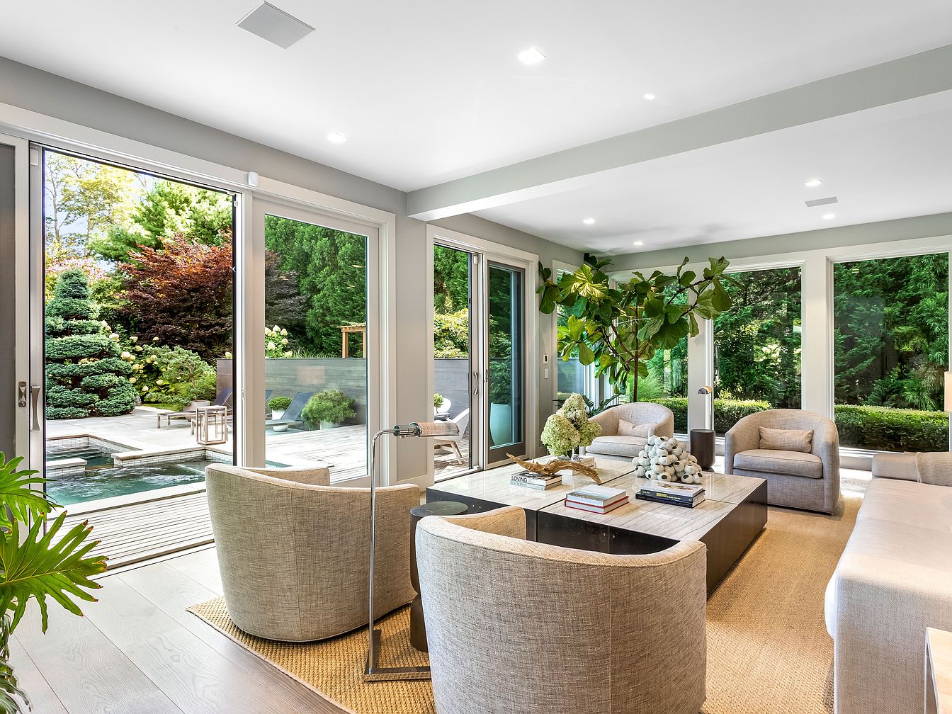 This spacious living room showcases an open and inviting layout with large glass sliding doors that seamlessly connect the indoor space to a lush, private garden and pool area. Soft neutral tones, including light grays and beige, combine with natural textures in the woven rug and linen-upholstered furniture to create a serene atmosphere. The room is anchored by a marble coffee table adorned with books and decorative accents, while a generous sectional and cozy armchairs offer ample seating for family gatherings. Abundant natural light, indoor greenery, and elegant minimalist décor provide a warm and family-friendly environment ideal for relaxation or entertaining.