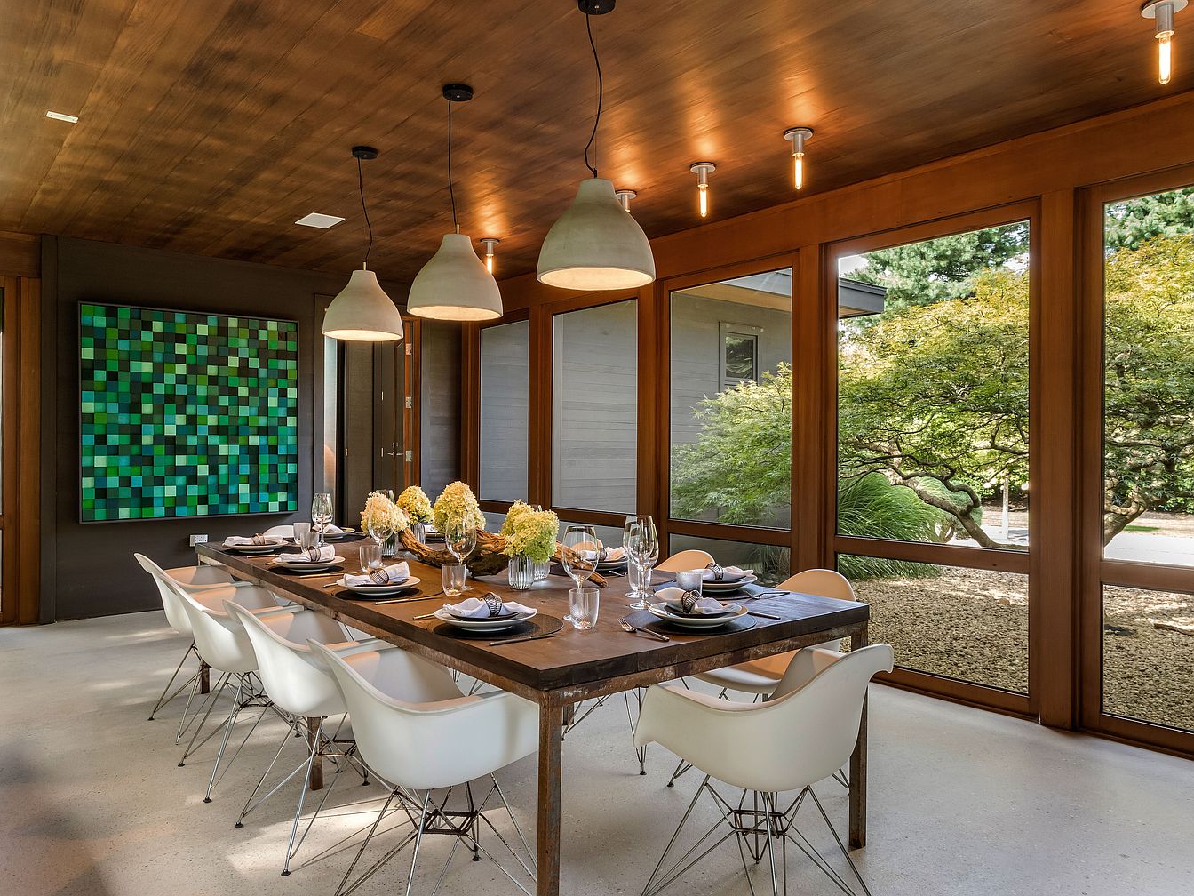 Spacious dining area featuring a long rustic wooden table surrounded by modern molded chairs, perfect for hosting family gatherings and meals. Large floor-to-ceiling windows wrap around the room, filling the space with natural light and offering serene views of lush landscaping outside. The wooden ceiling, warm neutral walls, and polished concrete floor create an inviting and contemporary ambiance. Overhead, three large pendant lights add a touch of elegance and softness. An eye-catching mosaic art piece brings vibrant greens and blues, providing a playful focal point. The setting is both stylish and welcoming, ideal for all family members.