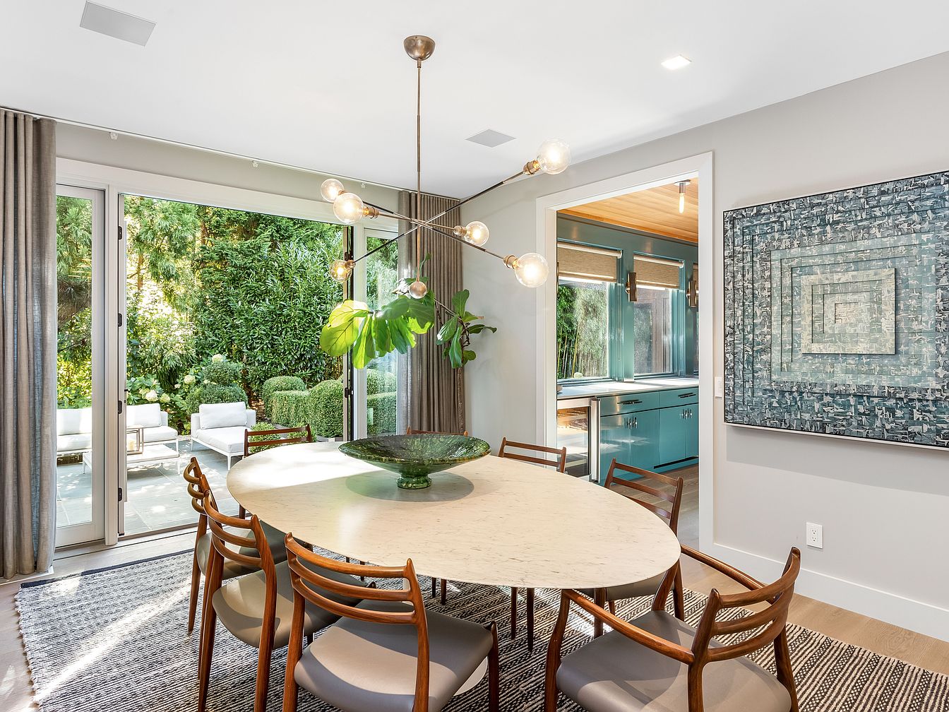 A bright, modern dining area offers an inviting space for gatherings, featuring an oval marble table surrounded by elegant wooden chairs with comfortable seating. Overhead, a contemporary light fixture with globe bulbs and leafy greenery adds a fresh, artistic touch. Floor-to-ceiling glass doors frame lush backyard views and allow ample natural light, while the adjacent kitchen enhances easy flow for family meals. Pale walls are complemented by a textured area rug, and a striking piece of geometric wall art adds sophistication. Neutral tones pull the room together, making it both stylish and welcoming for family-friendly dining and entertaining.