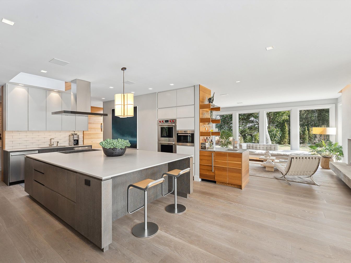 A spacious open-concept kitchen seamlessly flows into a light-filled living area, embodying contemporary style and family-friendly design. The kitchen features a large center island with bar seating for casual meals or homework sessions, complemented by modern cabinetry and stainless-steel appliances for convenience. Warm wood tones contrast with cool grey units and subway tile backsplash, creating a balanced, inviting palette. Expansive windows in the adjacent living space provide ample natural light and stunning views of greenery, while plush seating and sleek furnishings offer both comfort and sophistication, making it ideal for both family gatherings and entertaining guests.