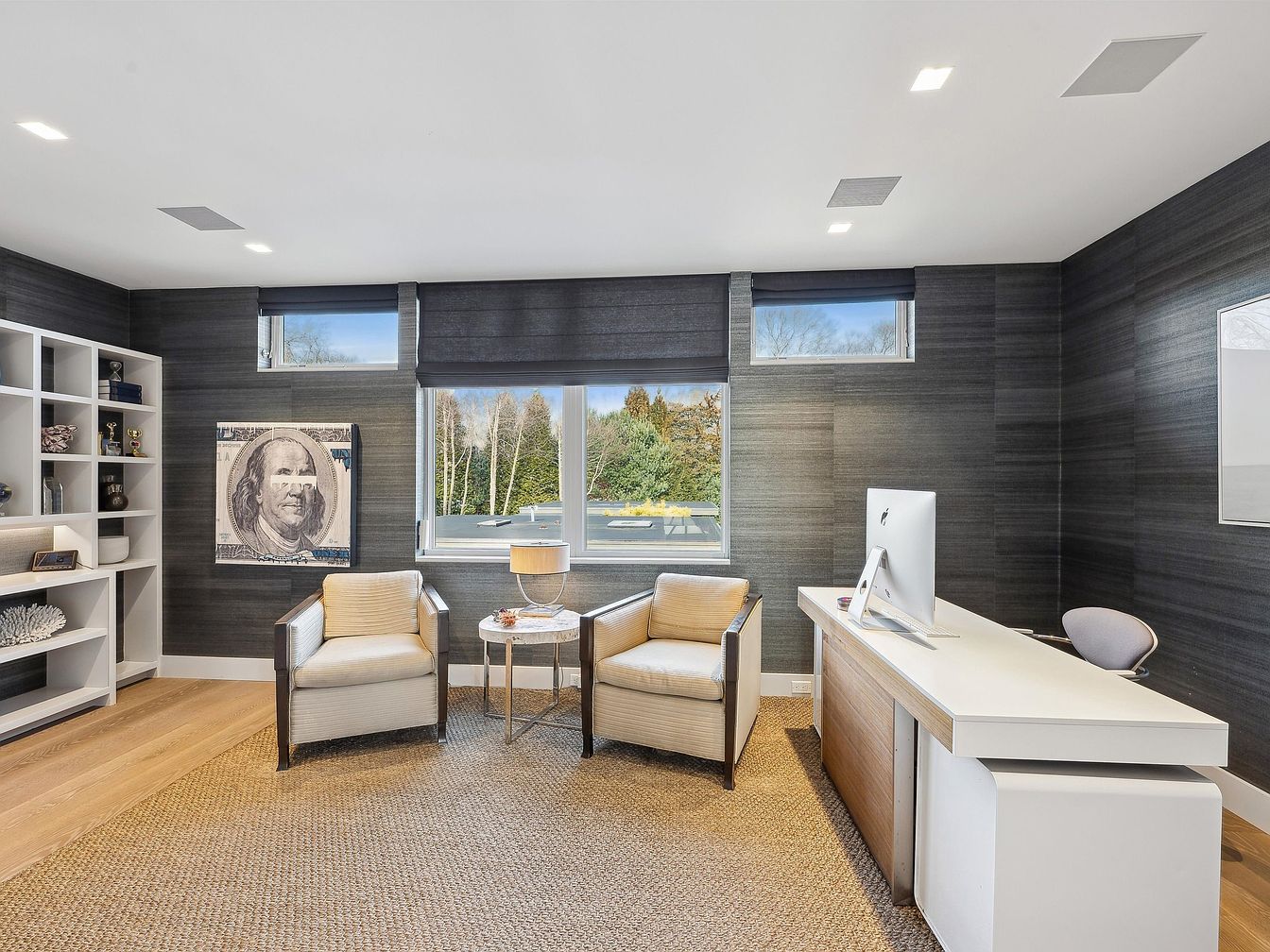 Sophisticated home office with a sleek modern design, featuring dark textured walls and large windows that bring in natural light and offer views of greenery outside. Built-in white shelving provides ample storage for books and decorative items, while a spacious white desk and ergonomic chair make it easy to stay organized and productive. Two beige armchairs and a round side table create a cozy spot for meetings or family study sessions. The neutral color palette blends creamy whites, warm wood tones, and gray accents for a calming environment, making this a welcoming and functional space for both work and family.