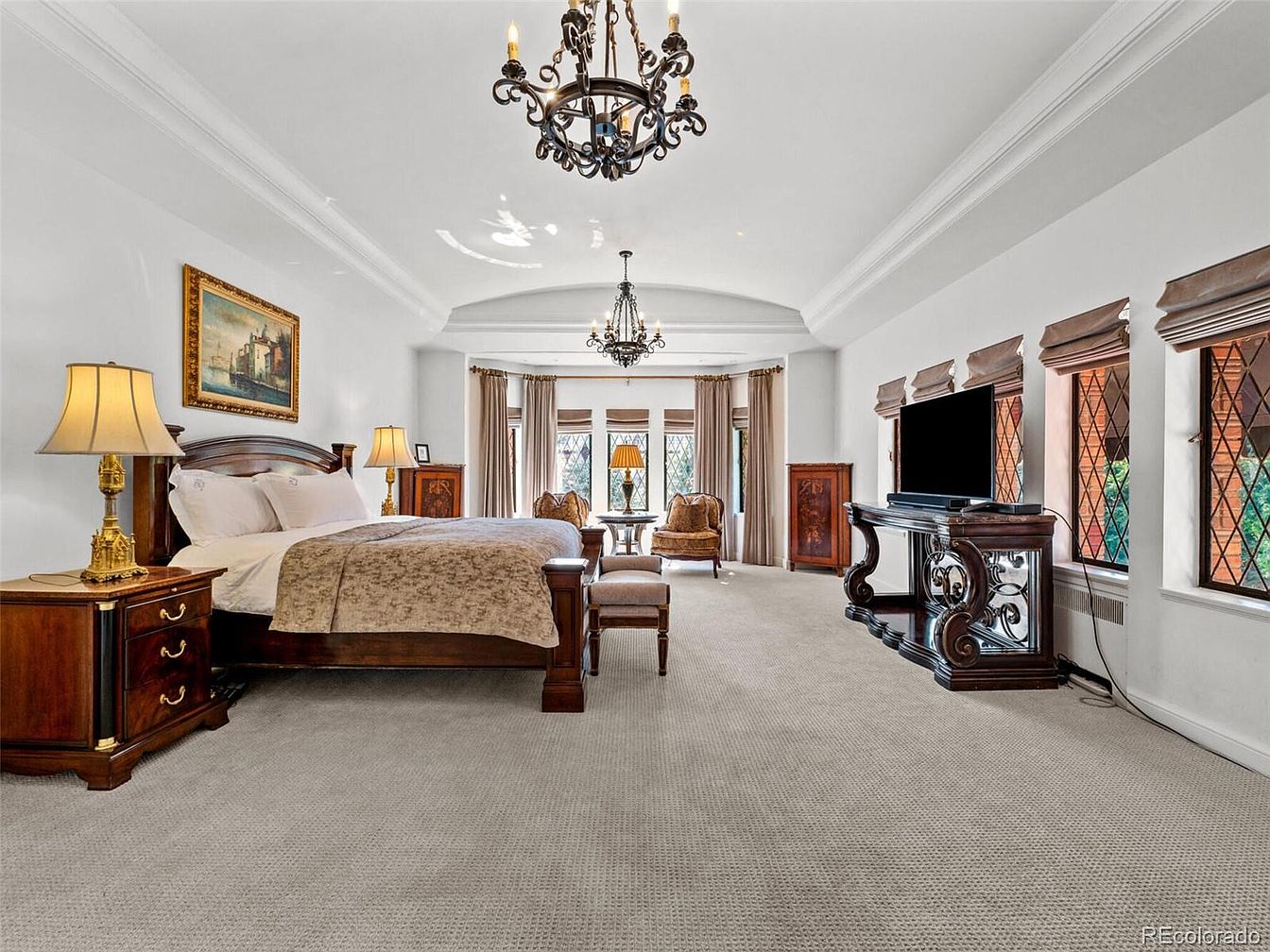This expansive master bedroom exudes classic elegance with an inviting layout perfect for relaxation or family time. Warm wood furnishings, including a grand bed with matching nightstands, complement the creamy walls and plush carpeting that runs wall-to-wall. Ornate chandeliers and vintage-style lamps create cozy ambient lighting, enhancing the welcoming atmosphere. Multiple diamond-paned windows draped with roman shades provide abundant natural light and views of the outdoors. The spacious seating area by the windows is ideal for reading or enjoying a quiet morning, and a large entertainment console makes it suitable for family movie nights. Overall, this space balances comfort and sophistication beautifully.
