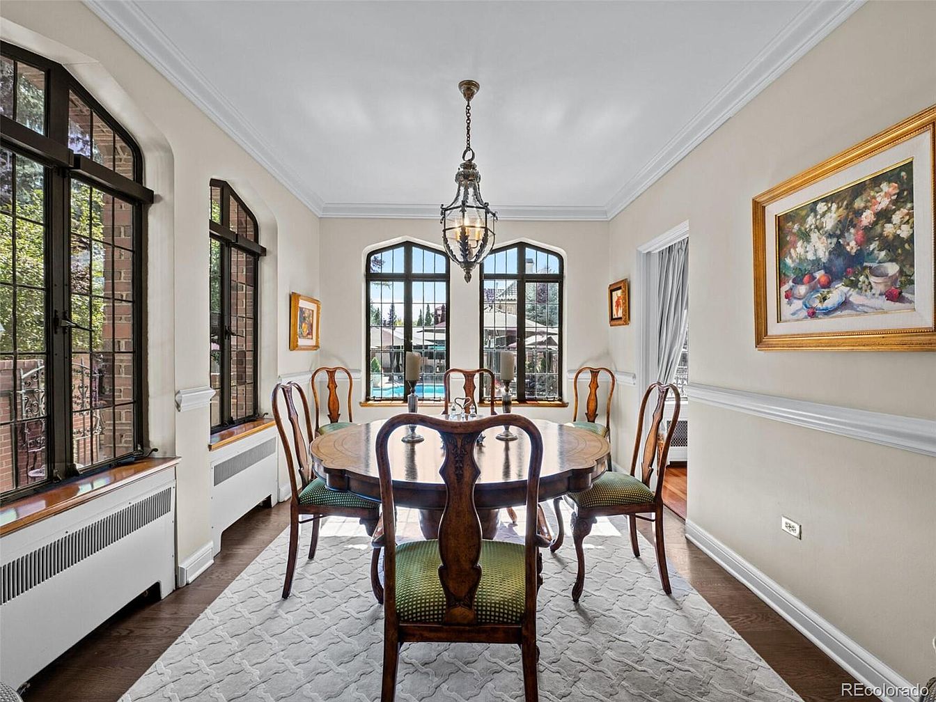 A light-filled dining room features elegant arched windows with black trim, bathing the space in natural sunlight and offering charming outdoor views. The classic wooden dining table, surrounded by carved chairs with green upholstered seats, sits atop a plush, light-colored area rug that adds warmth and comfort. Neutral wall tones and crisp crown molding maintain a fresh, timeless aesthetic, while colorful artwork in gold frames brightens the space. Family gatherings feel effortless here, with ample space around the table and easy access through wide doorways, making it an inviting and functional place for meals and conversation.