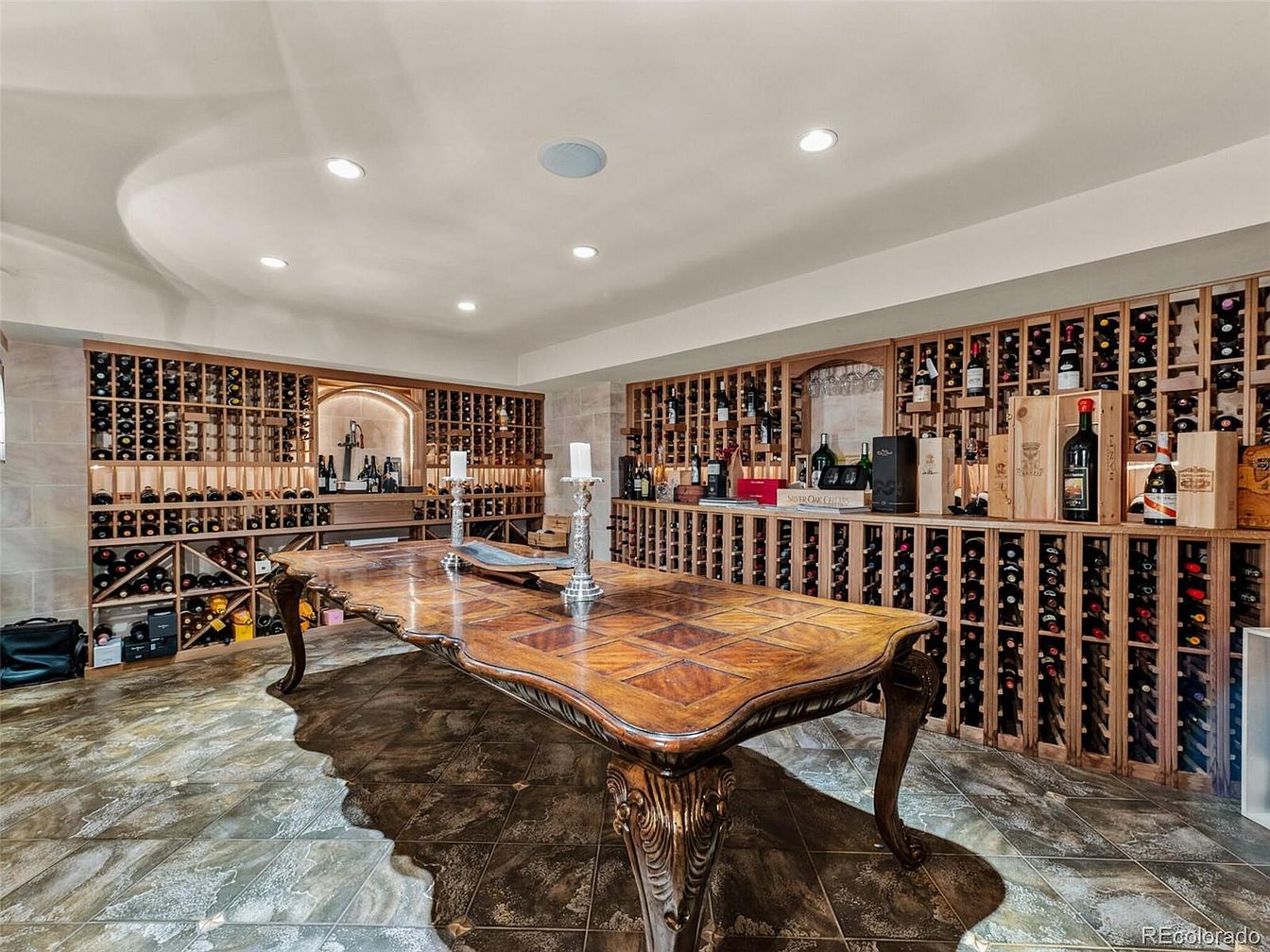This elegant wine cellar features expansive custom wood wine racks along two walls, providing ample storage for an extensive bottle collection. A statement carved wooden table serves as the centerpiece, ideal for tastings or family gatherings. The earthy tile flooring pairs seamlessly with the warm-toned cabinetry, creating a cozy yet luxurious ambiance. Recessed lighting highlights the room’s architectural details, while subtle alcoves add depth and display space for special bottles. The space is both functional and inviting, making it perfect for hosting intimate gatherings or family celebrations while ensuring wine is neatly organized and easily accessible.