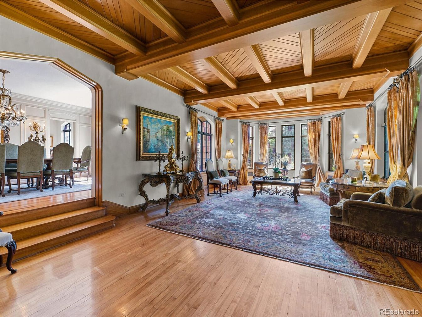 A grand formal living room showcases rich natural woodwork across the beamed ceiling and trim, creating a warm, welcoming ambiance. Large windows draped with elegant gold curtains allow natural light to flood the space, accentuating the intricate area rug and timeless furniture arranged for family conversation or entertaining guests. Plush sofas and armchairs offer comfort, while ornate tables and classic lamps bring sophistication and functionality. Family-friendly for gatherings, the step-up entry to the adjacent dining room transitions seamlessly, making this area perfect for hosting meals and special celebrations. Vibrant wall art and antiques complete the refined, traditional aesthetic.