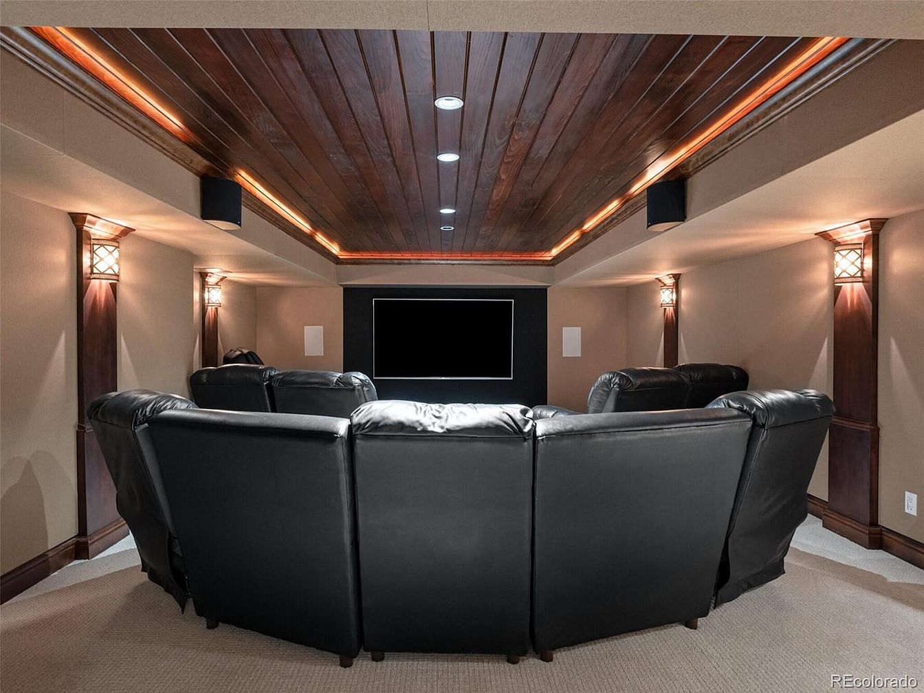 A cozy home theater featuring plush, black leather reclining seating arranged in a semi-circle provides an inviting space for the whole family to enjoy movie nights together. The room’s warm, neutral walls complement the rich wooden ceiling accented with recessed lighting and dramatic cove illumination. Elegant wall sconces add a touch of sophistication and provide soft ambient light without causing glare on the large projection screen. The intimate atmosphere and sound-absorbing materials make this space ideal for immersive entertainment experiences, bringing comfort and style together in a dedicated room focused on relaxation and shared enjoyment.