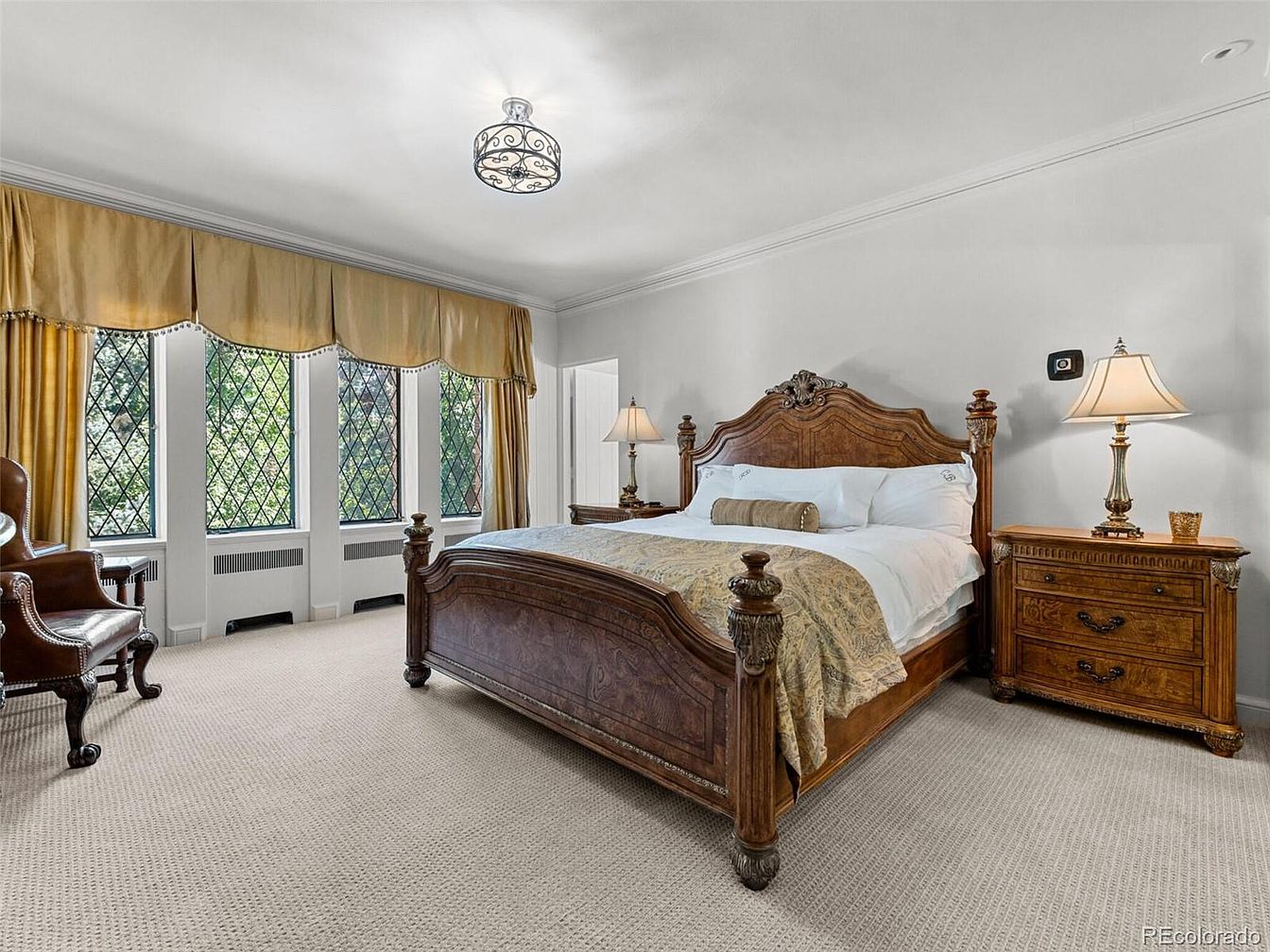 A spacious primary bedroom blends traditional elegance with comfort, featuring an intricately carved wooden bed framed by matching nightstands. The neutral, soft carpet adds warmth underfoot, ideal for families with children. Tall, leaded-glass windows bring in abundant natural light, accentuated by gold drapery for privacy. A cozy upholstered armchair rests in the corner, creating a perfect reading nook. The wall color is a crisp, clean white, highlighting the classic crown moldings and ornate furniture details. Elegant lamps on each nightstand provide soft, ambient lighting, contributing to a tranquil and welcoming atmosphere perfect for relaxation.