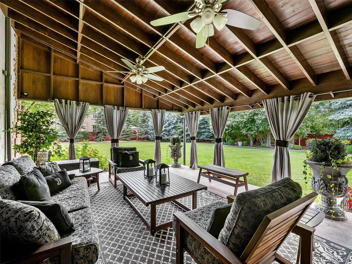 A spacious covered patio offers a welcoming outdoor living area ideal for relaxation and entertaining. Featuring rich wood beamed ceilings and dual ceiling fans, the space feels airy and comfortable even on warm days. Curtains add elegance while providing optional privacy from the lush backyard. Comfortable cushioned seating, two wooden coffee tables, and classic black-and-white patterns on the rug and upholstery create a cohesive, stylish look. Family-friendly touches include ample seating for gatherings and a large, open view of the yard where children can safely play within sight. Potted plants and lantern accents enhance the tranquil, inviting atmosphere.