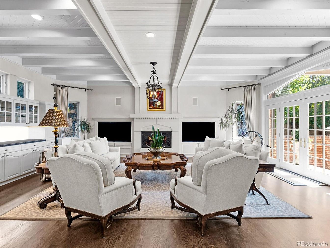 This spacious living room is designed with comfort and elegance in mind, featuring a harmonious blend of classic and contemporary elements. The neutral color palette, with soft beige and white tones, creates an inviting and serene atmosphere ideal for family time. Beautifully upholstered armchairs and sofas are arranged around a central wooden coffee table, encouraging conversation and relaxation. The exposed white beams and coffered ceiling add architectural charm, while the large French doors bathe the room in natural light and provide easy access to an outdoor patio. Two televisions flank the fireplace, making this space perfect for both quiet evenings and lively gatherings.