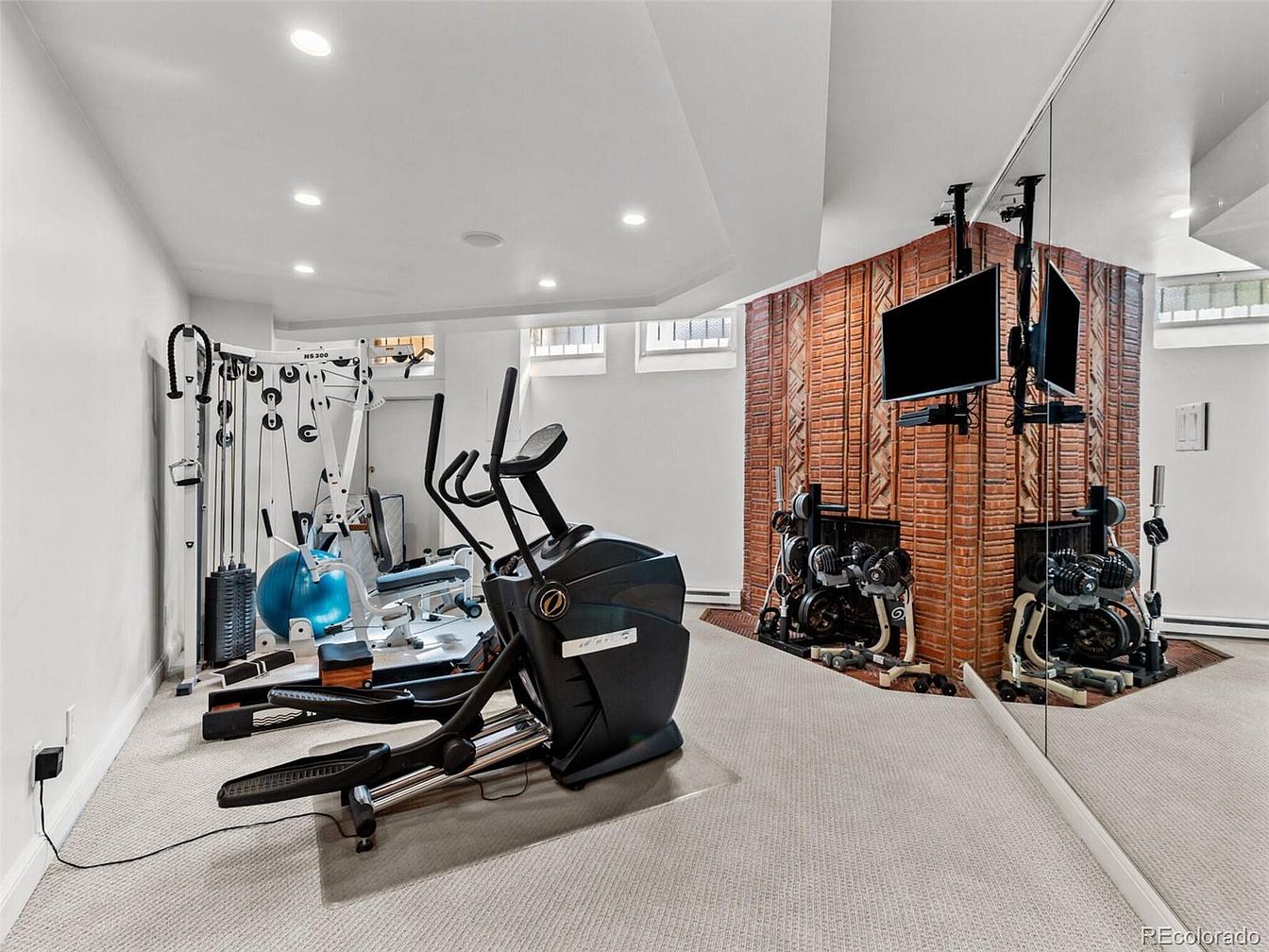 A spacious, light-filled basement gym features multiple pieces of modern workout equipment, including an elliptical, multi-function training machine, and stationary bikes. The neutral palette of creamy walls and soft beige carpeting gives the space a clean, open feeling, while recessed ceiling lights ensure brightness at all times. Large mirrors visually expand the area and help track workouts, and a mounted TV above a stylish, angular brick corner adds entertainment value and warmth. Ample floor space makes this gym accessible for the whole family, encouraging health and wellness routines right at home in a sleek, organized setting.