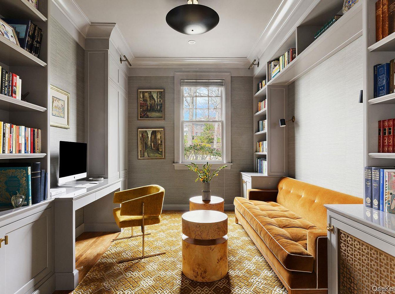 A stylish and functional home office features built-in bookshelves on both sides, framing a large window that fills the space with natural light. The room showcases a plush gold velvet sofa and a matching accent chair, both offering comfort for work or family gatherings. The geometric-patterned carpet complements the caramel tones of the furniture. Sleek white cabinets and a modern desk provide ample workspace and storage, making it ideal for adults and children alike. Framed artwork adds personality, while the layout encourages productivity and reading time, suitable for family-friendly multitasking.