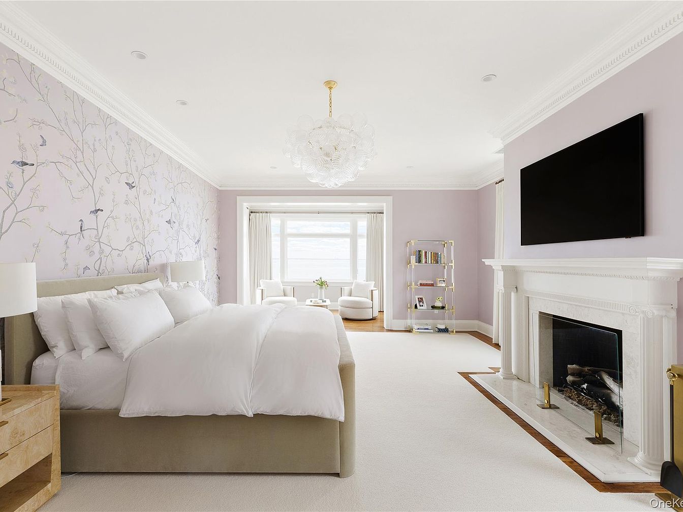 A serene and spacious master bedroom with elegant design touches, featuring a soothing pale lavender color palette and delicate wallpaper with a botanical motif for a tranquil atmosphere. Plush bedding and a neutral-upholstered bed invite comfort, while light wood nightstands blend seamlessly into the calm ambiance. The cozy sitting nook near floor-to-ceiling windows offers a picturesque spot for reading or relaxation. Architectural details like detailed crown molding and a grand white marble fireplace provide a refined, timeless look. Soft lighting from a unique statement chandelier ensures warmth, making the space inviting and suitable for families seeking both style and comfort.