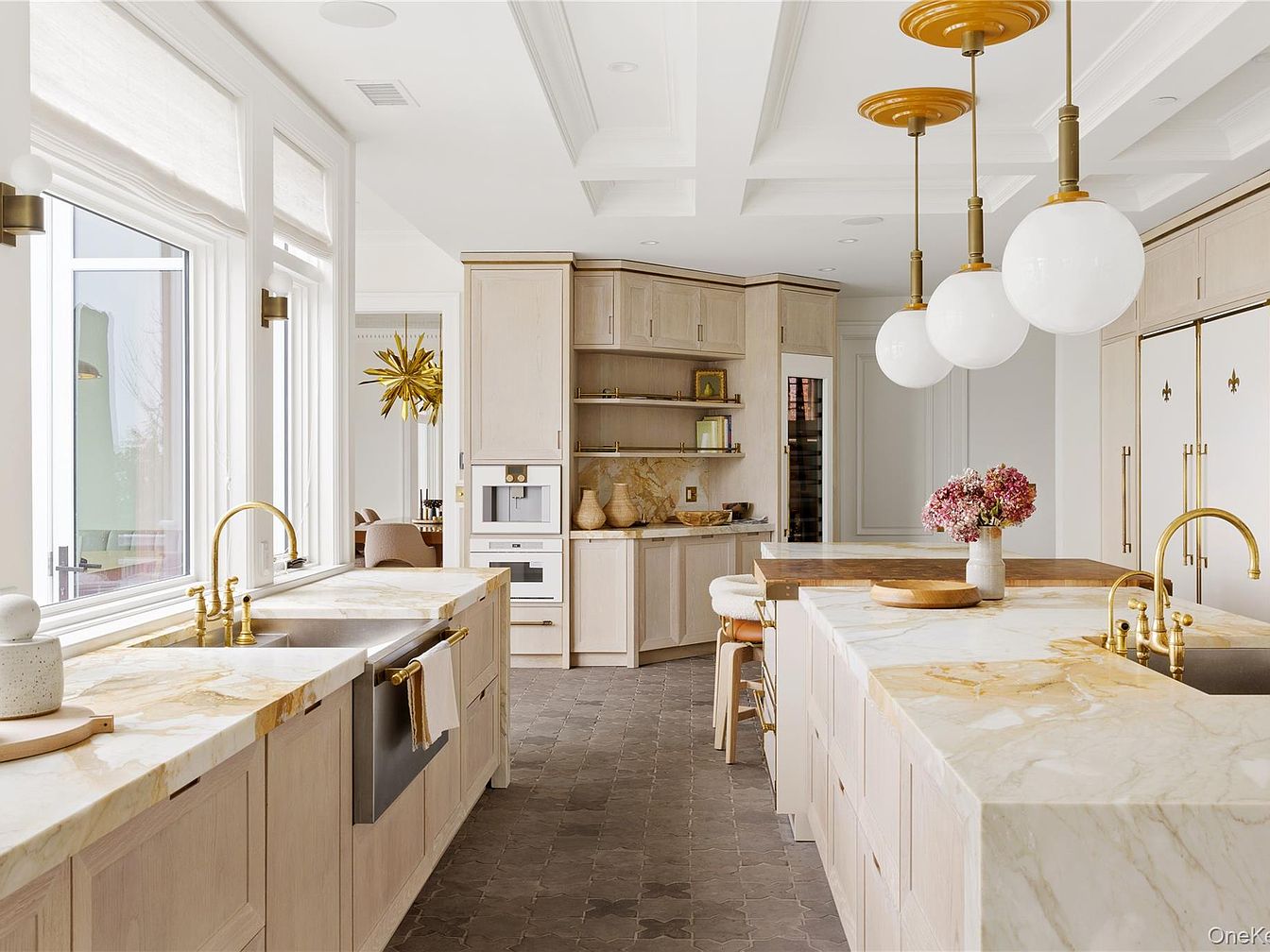 Spacious, airy, and welcoming, this kitchen features luxurious marble countertops and a palette of creamy whites paired with natural wood cabinetry. The large central island doubles as a prep space and gathering spot, making it perfect for family activities or casual dining. Brass fixtures and lighting accents add a touch of elegance, while abundant windows flood the room with natural light, creating a cheerful atmosphere. State-of-the-art appliances are thoughtfully integrated for convenience. The overall design blends modern sophistication with family-friendly functionality, providing ample storage, comfortable seating, and easy maintenance surfaces ideal for busy households.