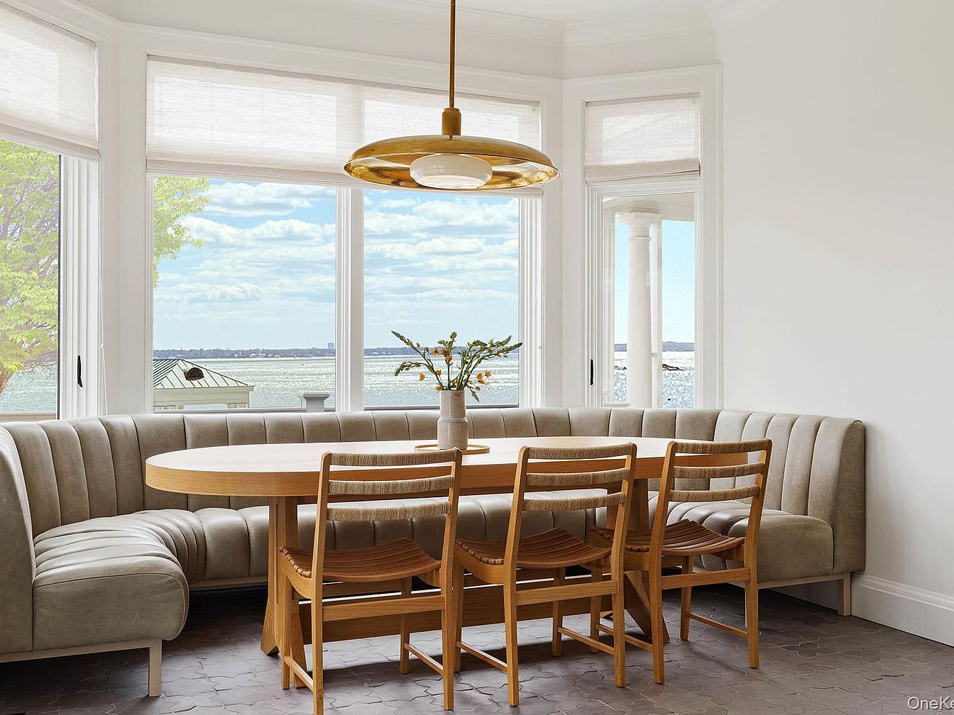 A bright and inviting breakfast nook features a custom-built light gray banquette that wraps around a circular wooden table, providing ample and cozy seating for family gatherings. Large windows flood the space with natural light and offer breathtaking waterfront views, creating a serene atmosphere. The neutral color palette is accented by light wood dining chairs and a striking brass pendant light overhead. Subtle architectural details, such as the window trim and tiled floors, add sophistication. Ideal for family meals or casual entertaining, the layout maximizes seating while maintaining an open, airy, and welcoming aesthetic.