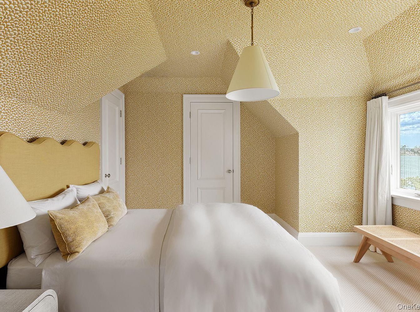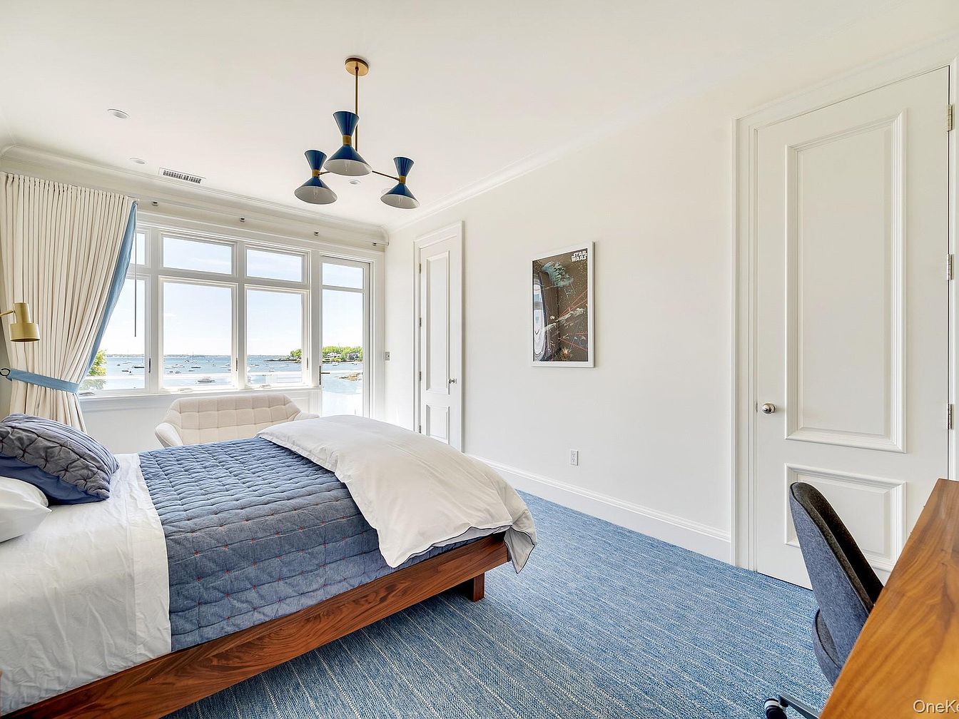 Bright and airy bedroom featuring expansive windows that offer spectacular waterfront views, making it a tranquil retreat for relaxation. The room is decorated in a soothing palette of white and blue, with a modern wood frame bed dressed in soft, quilted bedding. Plush carpeting underfoot creates a cozy atmosphere, while a contemporary light fixture and minimalist furnishings enhance the sense of space. A corner accent chair near the window provides a perfect spot to unwind as a family. Subtle wall art and classic moldings add refinement, ensuring the bedroom feels both sophisticated and inviting for all ages.