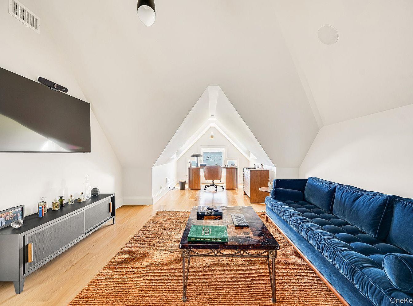 A bright attic office lounge with a unique vaulted ceiling features a mix of comfort and functionality, perfect for family life or remote work. A deep blue velvet sofa adds a touch of luxury, paired with a patterned coffee table over a warm, textured area rug. The room’s open layout allows seamless flow from the media area to a large office desk set near a window, maximizing natural light. White walls and wood floors enhance the spacious feel, while modern furniture and minimalist decor create a welcoming, family-friendly environment ideal for both relaxation and productivity.