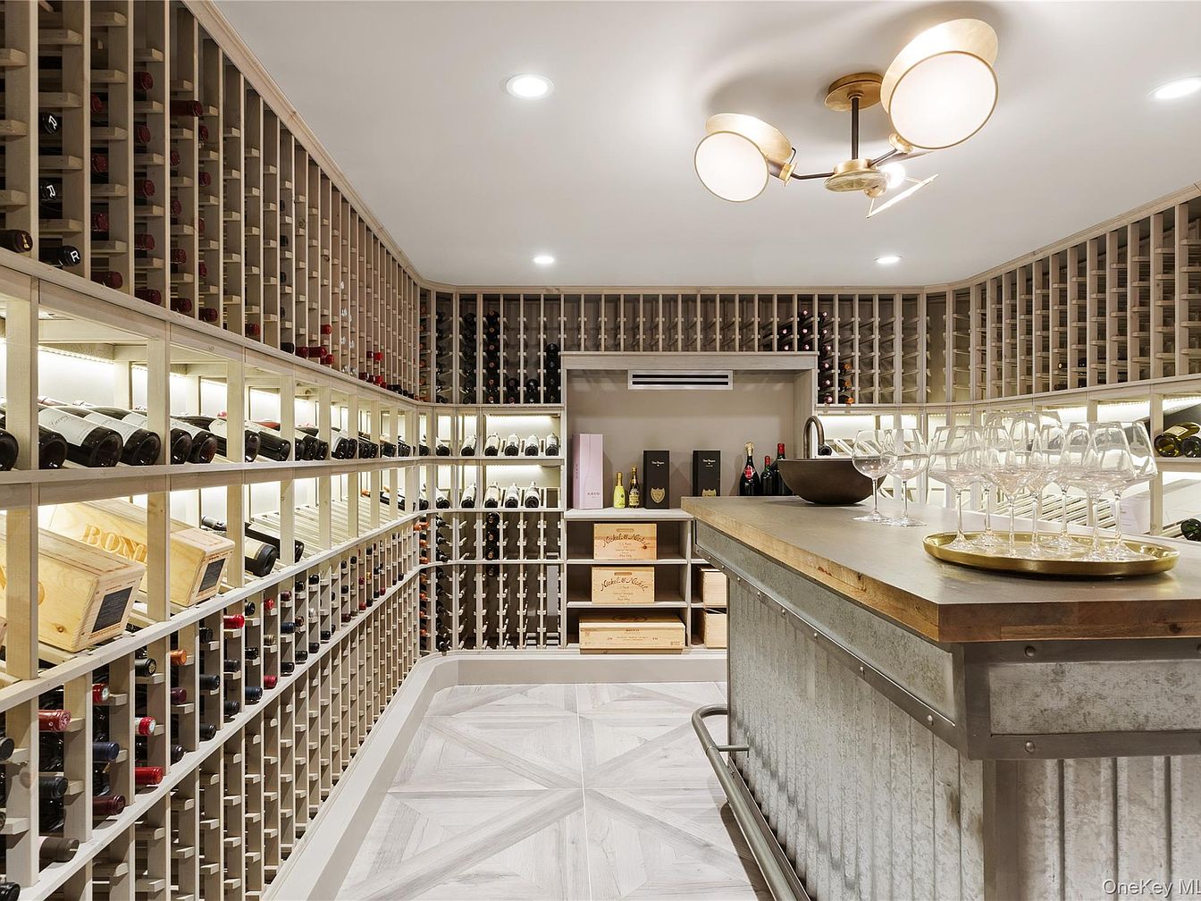This sophisticated wine cellar features custom floor-to-ceiling shelving in a neutral wood tone, creating an organized and visually appealing display for an extensive bottle collection. Understated recessed lighting and stylish ceiling fixtures give the space a welcoming glow. At the center, a rustic metal and wood bar acts as both a tasting station and a gathering spot, complete with a brass tray, elegant wine glasses, and a modern vessel sink. The light parquet flooring, uncluttered surfaces, and accessible racks are ideal for entertaining family and friends, making this room perfect for sharing and storing cherished vintages.