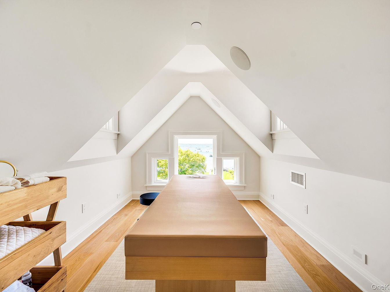 Tucked beneath charming pitched ceilings, this serene attic space offers an inviting home spa ambiance. Warm wood flooring and crisp white walls create an airy, tranquil atmosphere that’s perfect for relaxation. The massage table is ideally positioned to catch abundant natural light cascading through a trio of windows, which also frame a peaceful outdoor view. Practical open shelving provides neat storage for towels and essentials, making it easy to maintain order in a family environment. Clever architectural details and soft neutral colors enhance the feeling of spaciousness and calm, making this retreat both functional and family-friendly.