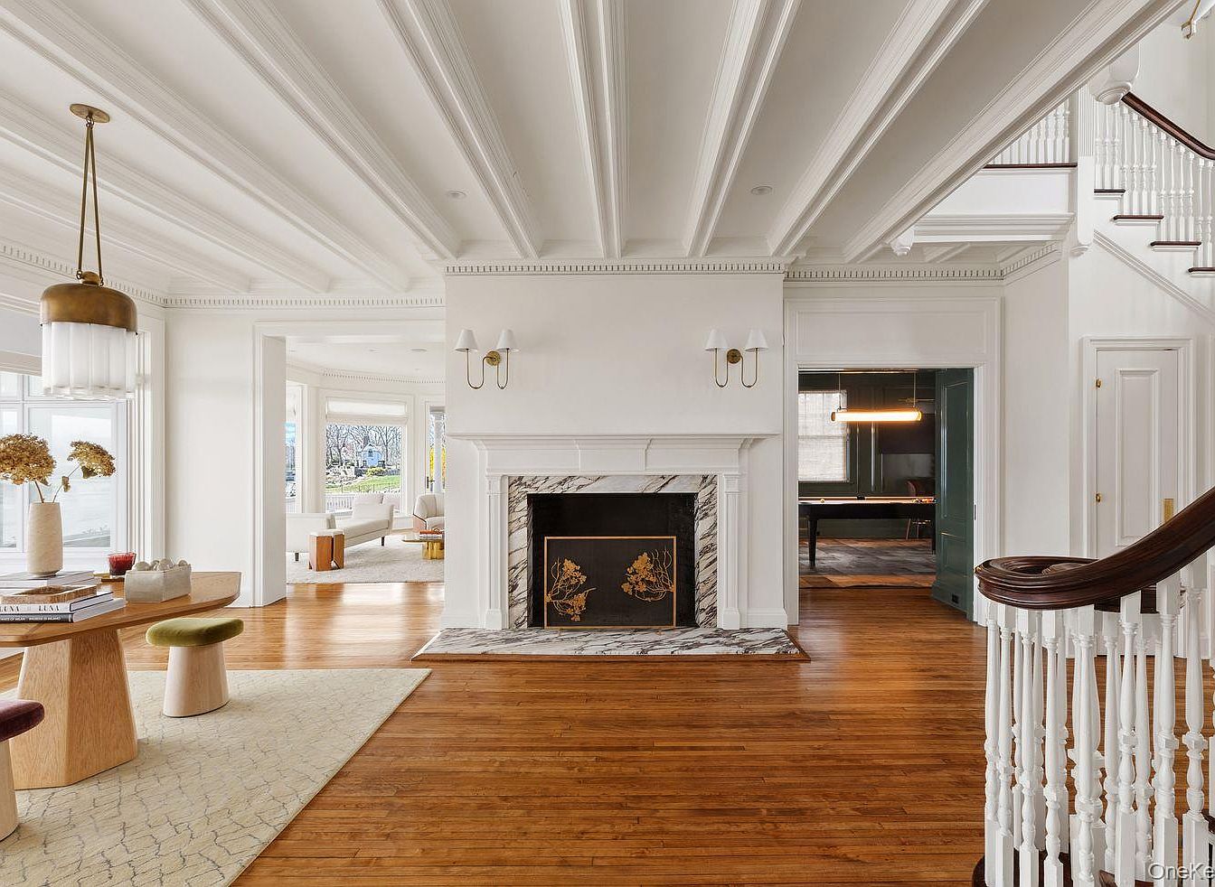 A grand formal living room is showcased with beautifully crafted coffered ceilings and pristine white walls, balanced by gleaming hardwood floors that bring warmth to the space. The focal point is a stately marble fireplace, accented with elegant wall sconces for a cozy yet sophisticated atmosphere. Large windows and open archways flood the room with natural light and create a welcoming flow into other spaces, ideal for family gatherings or entertaining guests. Subtle gold and brass details, soft neutral furnishings, and plush area rugs enhance family-friendly comfort in this inviting, tastefully decorated interior.