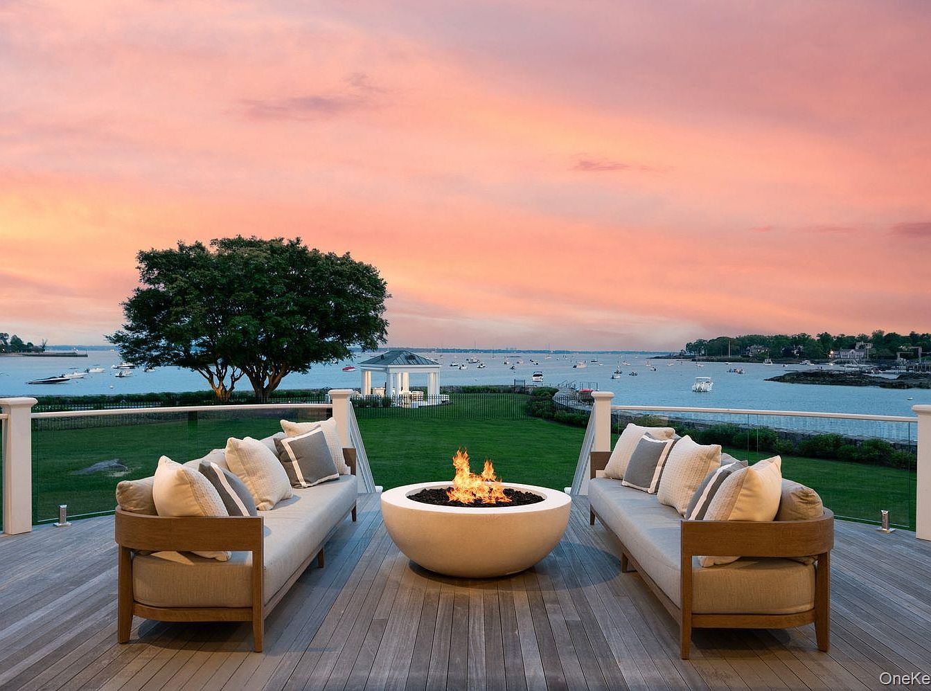A stunning waterfront patio features two modern wooden sofas with plush cream cushions arranged around a sleek, circular fire pit. The open deck overlooks a lush green lawn that leads down to the water, where boats gently float under a colorful sunset sky. Glass railing panels provide safety while preserving the breathtaking views, making this an ideal family space for relaxation and gatherings. The soft neutral color palette of the furnishings enhances the tranquil, coastal atmosphere, ensuring comfort and style for both children and adults. Ample outdoor seating makes this space perfect for entertaining or unwinding together.