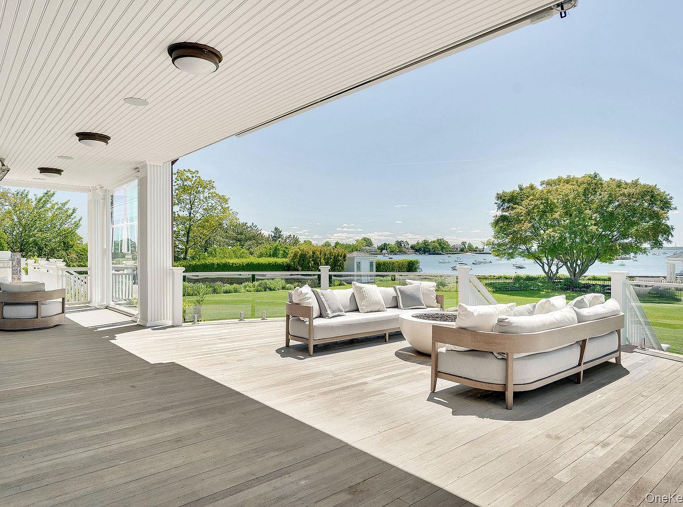 Expansive covered patio with pristine light wood decking offers a seamless transition from indoor comfort to outdoor relaxation. The elegant white ceiling with recessed and mounted lighting complements classic columns, adding a touch of sophistication. Plush outdoor sofas arranged around a modern fire table create a welcoming space for family gatherings. The arrangement invites easy conversation and relaxation while enjoying panoramic views of manicured lawns, mature trees, and tranquil water beyond. Neutral tones, soft cushions, and ample seating make this an idyllic spot for both adults and children, fostering connection in a serene, stylish riverside retreat.