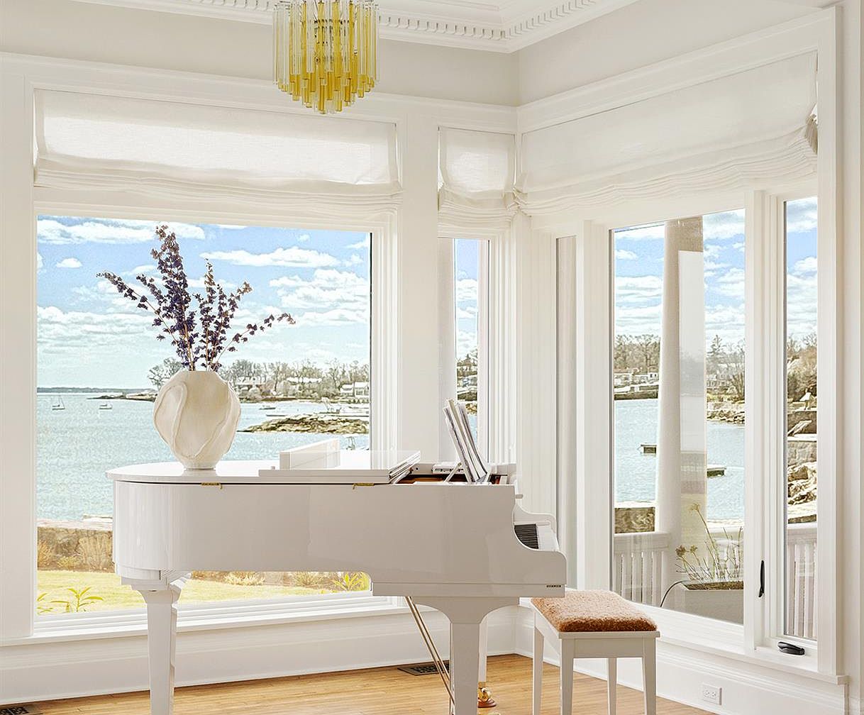 This bright and inviting music room boasts stunning water views from expansive floor-to-ceiling windows, filling the space with natural light. A glossy white grand piano serves as the centerpiece, complemented by a plush upholstered bench for comfort during long practice sessions. The serene, neutral palette of whites and creams, paired with delicate crown molding and elegant window treatments, creates an airy and sophisticated atmosphere. A sculptural vase with dried florals adds an artistic touch, while the open flow and ample natural light make this a perfect spot for family gatherings, music lessons, or peaceful moments overlooking the beautiful scenery.