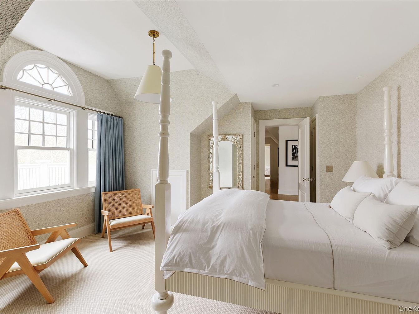 A serene bedroom retreat featuring a stately four-poster bed dressed in crisp white linens, offering a restful focal point. Softly textured wallpaper and a light, neutral color palette create a calm, welcoming ambiance perfect for a family home. Two modern wooden chairs with woven cane backs provide a cozy nook by the large window, ideal for reading or relaxing with a child. The arched window and elegant full-length mirror enhance the natural light and sense of space, while subtle architectural details like the sloped ceiling and gentle curves add charm and character to the overall design.